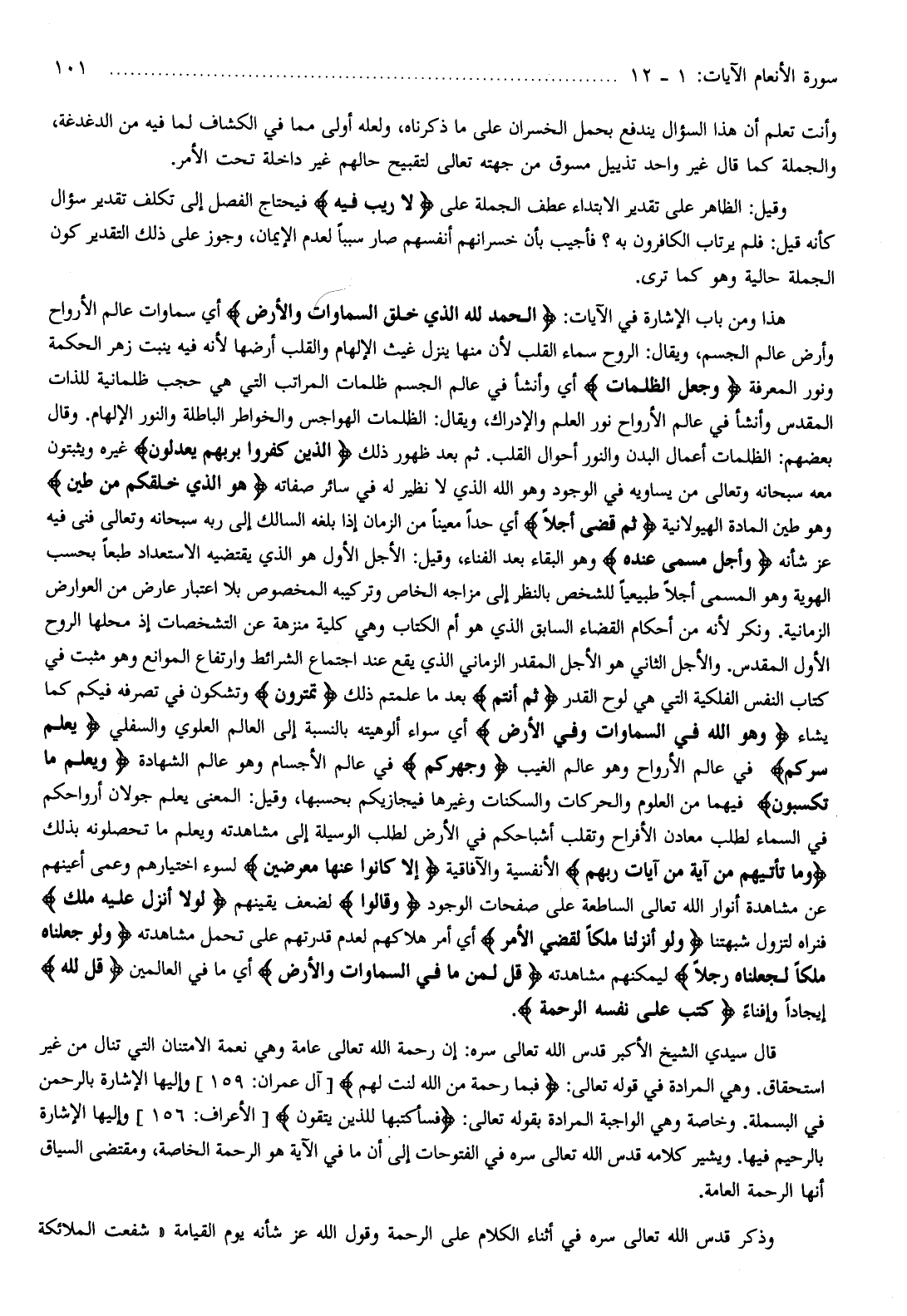 هذا ومن باب الإشارة في الآيات: الْحَمْدُ لِلَّهِ الَّذِي خَلَقَ السَّماواتِ وَالْأَرْضَ أي سماوات عالم الأرواح وأرض عالم الجسم، ويقال: الروح سماء القلب لأن منها ينزل غيث الإلهام والقلب أرضها لأنه فيه ينبت زهر الحكمة ونور المعرفة وَجَعَلَ الظُّلُماتِ أي وأنشأ في عالم الجسم ظلمات المراتب التي هي حجب ظلمانية للذات المقدس وأنشأ في عالم الأرواح نور العلم والإدراك، ويقال: الظلمات الهواجس والخواطر الباطلة والنور الإلهام. وقال بعضهم: الظلمات أعمال البدن والنور أحوال القلب. ثم بعد ظهور ذلك الَّذِينَ كَفَرُوا بِرَبِّهِمْ يَعْدِلُونَ غيره ويثبتون معه سبحانه وتعالى من يساويه في الوجود وهو الله الذي لا نظير له في سائر صفاته هُوَ الَّذِي خَلَقَكُمْ مِنْ طِينٍ وهو طين المادة الهيولانية ثُمَّ قَضى أَجَلًا أي حدا معينا من الزمان إذا بلغه السالك إلى ربه سبحانه وتعالى فنى فيه عز شأنه وَأَجَلٌ مُسَمًّى عِنْدَهُ وهو البقاء بعد الفناء، وقيل: الأجل الأول هو الذي يقتضيه الاستعداد طبعا بحسب الهوية وهو المسمى أجلا طبيعيا للشخص بالنظر إلى مزاجه الخاص وتركيبه المخصوص بلا اعتبار عارض من العوارض الزمانية. ونكر لأنه من أحكام القضاء السابق الذي هو أم الكتاب وهي كلية منزهة عن التشخصات إذ محلها الروح الأول المقدس. والأجل الثاني هو الأجل المقدر الزماني الذي يقع عند اجتماع الشرائط وارتفاع الموانع وهو مثبت في كتاب النفس الفلكية التي هي لوح القدر ثُمَّ أَنْتُمْ بعد ما علمتم ذلك تَمْتَرُونَ وتشكون في تصرفه فيكم كما يشاء وَهُوَ اللَّهُ فِي السَّماواتِ وَفِي الْأَرْضِ أي سواء ألوهيته بالنسبة إلى العالم العلوي والسفلي يَعْلَمُ سِرَّكُمْ في عالم الأرواح وهو عالم الغيب وَجَهْرَكُمْ في عالم الأجسام وهو عالم الشهادة وَيَعْلَمُ ما تَكْسِبُونَ فيهما من العلوم والحركات والسكنات وغيرها فيجازيكم بحسبها، وقيل: المعنى يعلم جولان أرواحكم في السماء لطلب معادن الأفراح وتقلب أشباحكم في الأرض لطلب الوسيلة إلى مشاهدته ويعلم ما تحصلونه بذلك وَما تَأْتِيهِمْ مِنْ آيَةٍ مِنْ آياتِ رَبِّهِمْ الأنفسية والآفاقية إِلَّا كانُوا عَنْها مُعْرِضِينَ لسوء اختيارهم وعمى أعينهم عن مشاهدة أنوار الله تعالى الساطعة على صفحات الوجود وَقالُوا لضعف يقينهم لَوْلا أُنْزِلَ عَلَيْهِ مَلَكٌ فنراه لتزول شبهتنا وَلَوْ أَنْزَلْنا مَلَكاً لَقُضِيَ الْأَمْرُ أي أمر هلاكهم لعدم قدرتهم على تحمل مشاهدته وَلَوْ جَعَلْناهُ مَلَكاً لَجَعَلْناهُ رَجُلًا ليمكنهم مشاهدته قُلْ لِمَنْ ما فِي السَّماواتِ وَالْأَرْضِ أي ما في العالمين قُلْ لِلَّهِ إيجادا وإفناء كَتَبَ عَلى نَفْسِهِ الرَّحْمَةَ.