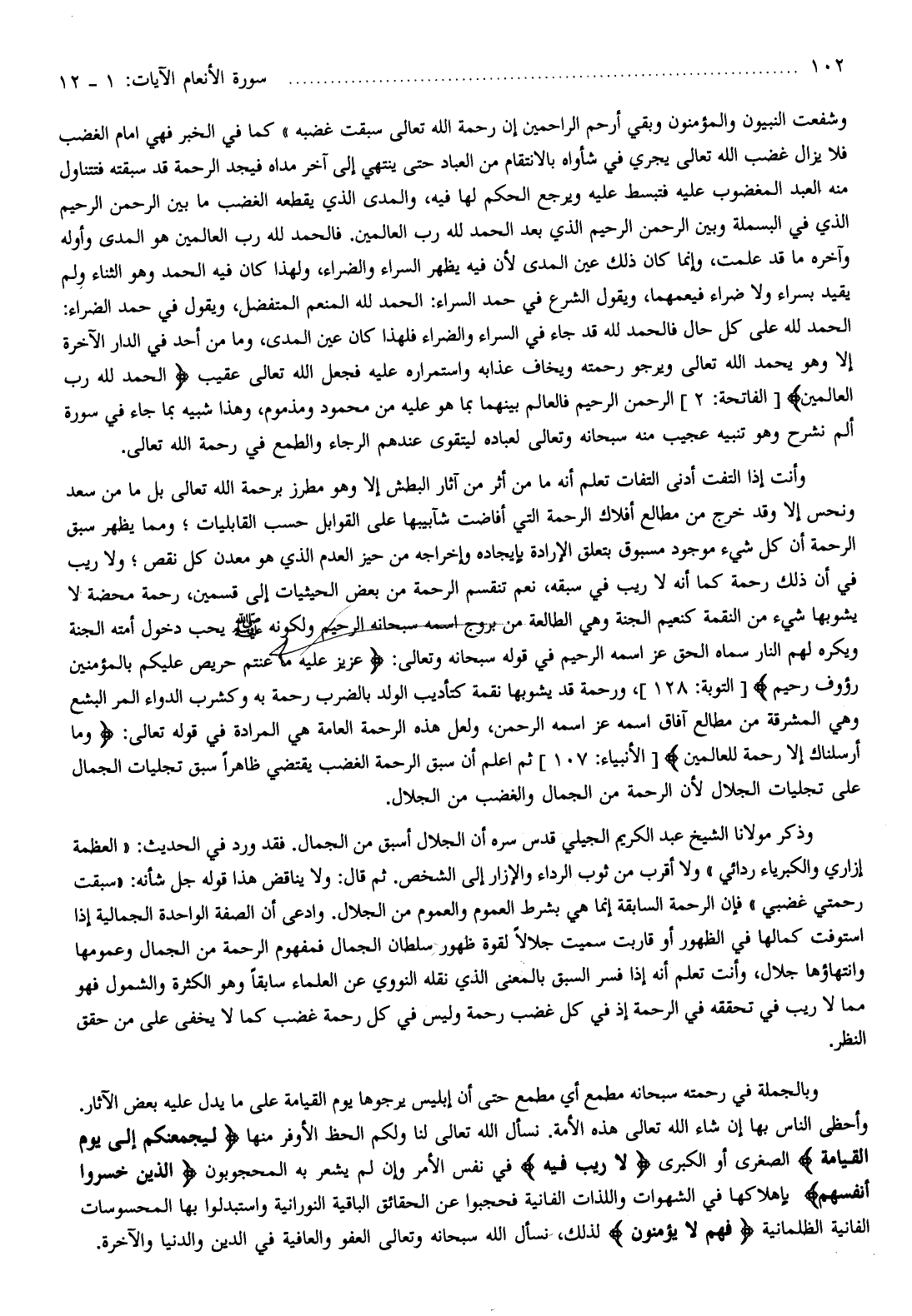 وأحظى الناس بها إن شاء الله تعالى هذه الأمة. نسأل الله تعالى لنا ولكم الحظ الأوفر منها لَيَجْمَعَنَّكُمْ إِلى يَوْمِ الْقِيامَةِ الصغرى أو الكبرى لا رَيْبَ فِيهِ في نفس الأمر وإن لم يشعر به المحجوبون الَّذِينَ خَسِرُوا أَنْفُسَهُمْ بإهلاكها في الشهوات واللذات الفانية فحجبوا عن الحقائق الباقية النورانية واستبدلوا بها المحسوسات الفانية الظلمانية فَهُمْ لا يُؤْمِنُونَ لذلك، نسأل الله سبحانه وتعالى العفو والعافية في الدين والدنيا والآخرة.