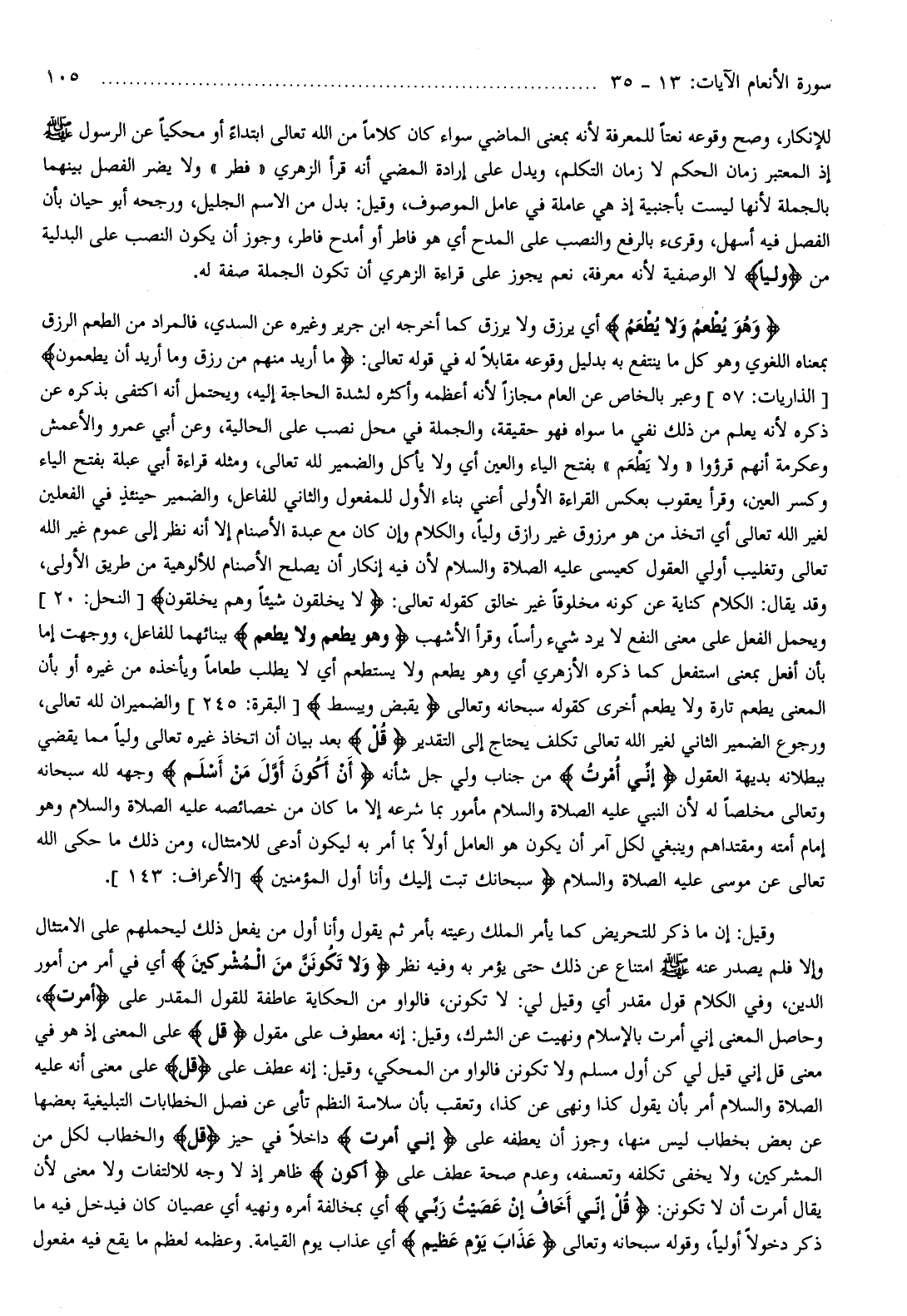 وقيل: إن ما ذكر للتحريض كما يأمر الملك رعيته بأمر ثم يقول وأنا أول من يفعل ذلك ليحملهم على الامتثال وإلا فلم يصدر عنه صلّى الله عليه وسلّم امتناع عن ذلك حتى يؤمر به وفيه نظر وَلا تَكُونَنَّ مِنَ الْمُشْرِكِينَ أي في أمر من أمور الدين، وفي الكلام قول مقدر أي وقيل لي: لا تكونن، فالواو من الحكاية عاطفة للقول المقدر على أُمِرْتُ، وحاصل المعنى إني أمرت بالإسلام ونهيت عن الشرك، وقيل: إنه معطوف على مقول قُلْ على المعنى إذ هو في معنى قل إني قيل لي كن أول مسلم ولا تكونن فالواو من المحكي، وقيل: إنه عطف على قُلْ على معنى أنه عليه الصلاة والسلام أمر بأن يقول كذا ونهى عن كذا، وتعقب بأن سلاسلة النظم تأبى عن فصل الخطابات التبليغية بعضها عن بعض بخطاب ليس منها، وجوز أن يعطفه على إِنِّي أُمِرْتُ داخلا في حيز قُلْ والخطاب لكل من المشركين، ولا يخفى تكلفه وتعسفه، وعدم صحة عطف على أَكُونَ ظاهر إذ لا وجه للالتفات ولا معنى لأن يقال أمرت أن لا تكونن: قُلْ إِنِّي أَخافُ إِنْ عَصَيْتُ رَبِّي أي بمخالفة أمره ونهيه أي عصيان كان فيدخل فيه ما ذكر دخولا أوليا، وقوله سبحانه وتعالى عَذابَ يَوْمٍ عَظِيمٍ أي عذاب يوم القيامة. وعظمه لعظم ما يقع فيه مفعول