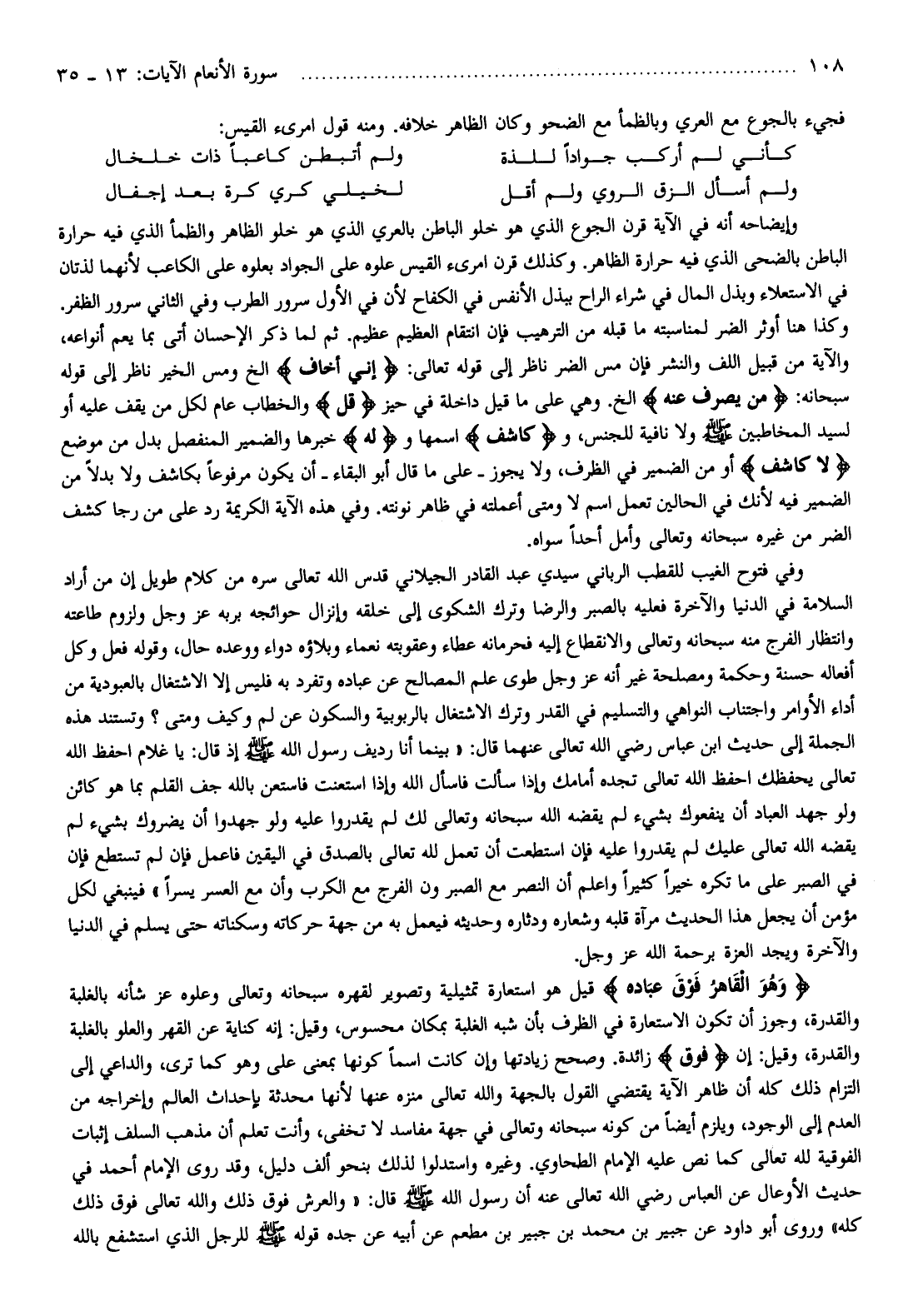 وفي فتوح الغيب للقطب الرباني سيدي عبد القادر الجيلاني قدس الله تعالى سره من كلام طويل إن من أراد السلامة في الدنيا والآخرة فعليه بالصبر والرضا وترك الشكوى إلى خلقه وإنزال حوائجه بربه عز وجل ولزوم طاعته وانتظار الفرج منه سبحانه وتعالى والانقطاع إليه فحرمانه عطاء وعقوبته نعماء وبلاؤه دواء ووعده حال، وقوله فعل وكل أفعاله حسنة وحكمة ومصلحة غير أنه عز وجل طوى علم المصالح عن عباده وتفرد به فليس إلا الاشتغال بالعبودية من أداء الأوامر واجتناب النواهي والتسليم في القدر وترك الاشتغال بالربوبية والسكون عن لم وكيف ومتى؟ وتستند هذه الجملة