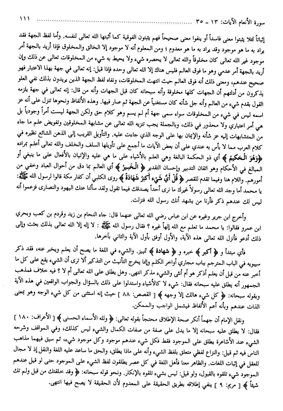 إثباتا لئلا يثبتوا معنى فاسدا أو ينفوا معنى صحيحا فهم يثبتون الفوقية كما أثبتها الله تعالى لنفسه. وأما لفظ الجهة فقد يراد به ما هو موجود وقد يراد به ما هو معدوم ومن المعلوم أنه لا موجود إلا الخالق والمخلوق فإذا أريد بالجهة أمر موجود غير الله تعالى كان مخلوقا والله تعالى لا يحصره شيء ولا يحيط به شيء من المخلوقات تعالى عن ذلك وإن أريد بالجهة أمر عدمي وهو ما فوق العالم فليس هناك إلا الله تعالى وحده فإذا قيل: إنه تعالى في جهة بهذا الاعتبار فهو صحيح عندهم، ومعنى ذلك أنه فوق العالم حيث انتهت المخلوقات، ونفاه لفظ الجهة الذين يريدون بذلك نفي العلو يذكرون من أدلتهم أن الجهات كلها مخلوقة وأنه سبحانه كان قبل الجهات وأنه من قال: إنه تعالى في جهة يلزمه القول بقدم شيء من العالم وأنه جل شأنه كان مستغنيا عن الجهة ثم صار فيها. وهذه الألفاظ ونحوها تنزل على أنه عز اسمه ليس في شيء من المخلوقات سواء سمى جهة أم لم يسم وهو كلام حق ولكن الجهة ليست أمرا وجوديا بل هي أمر اعتباري ولا محذور في ذلك، وبالجملة يجب تنزيه الله تعالى عن مشابهة المخلوقين وتفويض علم ما جاء من المتشابهات إليه عز شأنه والإيمان بها على الوجه الذي جاءت عليه. والتأويل القريب إلى الذهن الشائع نظيره في كلام العرب مما لا بأس به عندي على أن بعض الآيات ما أجمع على تأويلها السلف والخلف والله تعالى أعلم بمراده وَهُوَ الْحَكِيمُ أي ذو الحكمة البالغة وهي العلم بالأشياء على ما هي عليه والإتيان بالأفعال على ما ينبغي أو المبالغ في الأحكام وهو إتقان التدبير وإحسان التقدير الْخَبِيرُ أي العالم بما دق من أحوال العباد وخفي من أمورهم. واللام هنا وفيما تقدم للقصر قُلْ أَيُّ شَيْءٍ أَكْبَرُ شَهادَةً
