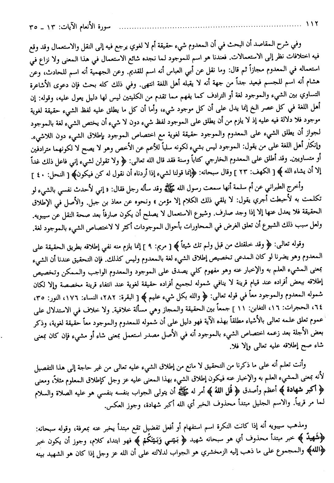 وإنكار أهل اللغة على من يقول: الموجود ليس بشيء لكونه سلبا للأعم عن الأخص وهو لا يصح لا لكونهما مترادفين أو متساويين. وقد أطلق على المعدوم الخارجي كتابا وسنة فقد قال الله تعالى: وَلا تَقُولَنَّ لِشَيْءٍ إِنِّي فاعِلٌ ذلِكَ غَداً إِلَّا أَنْ يَشاءَ اللَّهُ [الكهف: 23] وقال سبحانه: إِنَّما قَوْلُنا لِشَيْءٍ إِذا أَرَدْناهُ أَنْ نَقُولَ لَهُ كُنْ فَيَكُونُ [النحل: 40]