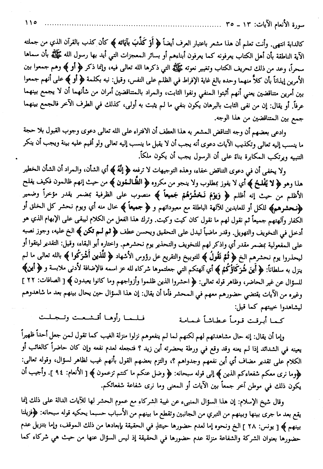 ولا يخفى أن في دعوى التناقض خفاء، وهذه التوجيهات لا ترفعه إِنَّهُ أي الشأن، والمراد أن الشأن الخطير هذا وهو لا يُفْلِحُ أي لا يفوز بمطلوب ولا ينجو من مكروه الظَّالِمُونَ من حيث إنهم ظالمون فكيف يفلح الأظلم من حيث إنه أظلم وَيَوْمَ نَحْشُرُهُمْ جَمِيعاً منصوب على الظرفية بمضمر يقدر مؤخرا وضمير نَحْشُرُهُمْ للكل أو للعابدين للآلهة الباطلة مع معبوداتهم وجَمِيعاً خال منه أي ويوم نحشر كل الخلق أو الكفار وآلهتهم جميعا ثم نقول لهم ما نقول كان كيت وكيت. وترك هذا الفعل من الكلام ليبقى على الإبهام الذي هو أدخل في التخويف والتهويل. وقدر ماضيا ليدل على التحقيق ويحسن عطف ثُمَّ لَمْ تَكُنْ إلخ عليه، وجوز نصبه على المفعولية بمضمر مقدر أي واذكر لهم للتخويف والتحذير يوم نحشرهم. واختاره أبو البقاء، وقيل: التقدير ليتقوا أو ليحذروا يوم نحشرهم إلخ ثُمَّ نَقُولُ للتوبيخ والتقريع على رؤوس الأشهاد لِلَّذِينَ أَشْرَكُوا بالله تعالى ما لم ينزل به سلطانا: أَيْنَ شُرَكاؤُكُمُ أي آلهتكم التي جعلتموها شركاء لله عز اسمه فالإضافة لأدنى ملابسة وأَيْنَ للسؤال عن غير الحاضر، وظاهر قوله تعالى: احْشُرُوا الَّذِينَ ظَلَمُوا وَأَزْواجَهُمْ وَما كانُوا يَعْبُدُونَ [الصافات: 22] وغيره من الآيات يقتضي حضورهم معهم في المحشر فأما أن يقال: إن هذا السؤال حين يحال بينهم بعد ما شاهدوهم ليشاهدوا خيبتهم كما قيل: