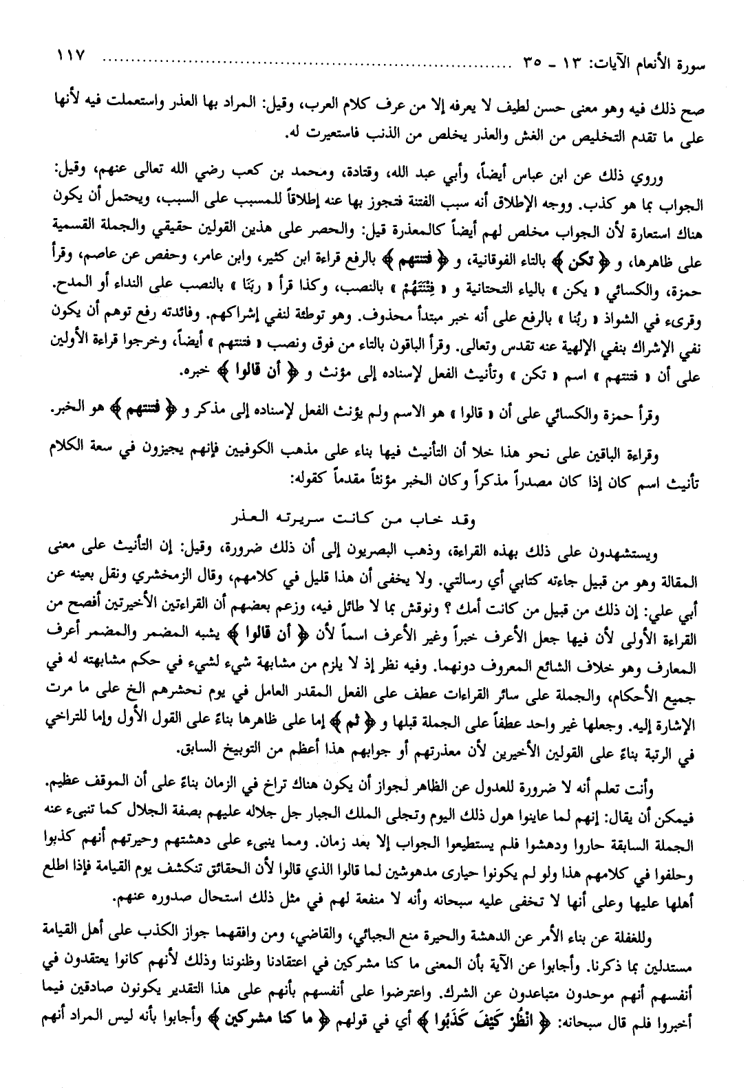 الجواب بما هو كذب. ووجه الإطلاق أنه سبب الفتنة فتجوز بها عنه إطلاقا للمسبب على السبب، ويحتمل أن يكون هناك استعارة لأن الجواب مخلص لهم أيضا كالمعذرة قيل: والحصر على هذين القولين حقيقي والجملة القسمية على ظاهرها، وتَكُنْ بالتاء الفوقانية، وفِتْنَتُهُمْ بالرفع قراءة ابن كثير، وابن عامر، وحفص عن عاصم، وقرأ حمزة، والكسائي «يكن» بالياء التحتانية و «فتنتهم» بالنصب، وكذا قرأ «ربنا» بالنصب على النداء أو المدح.