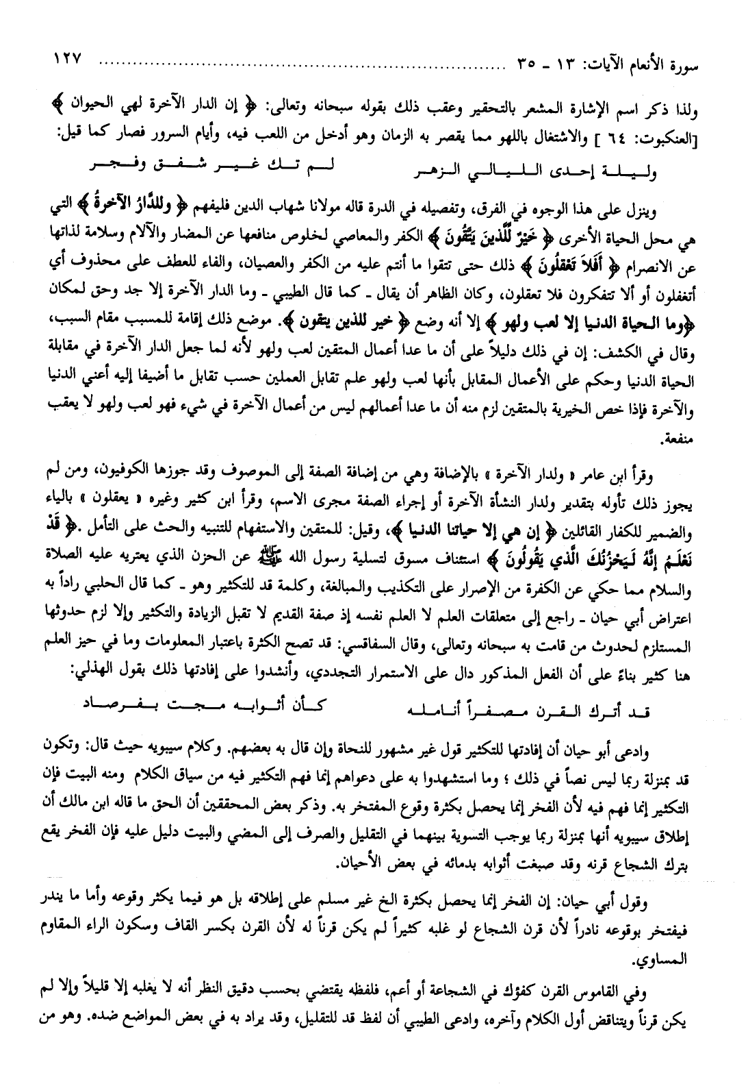 وقرأ ابن عامر «ولدار الآخرة» بالإضافة وهي من إضافة الصفة إلى الموصوف وقد جوزها الكوفيون، ومن لم يجوز ذلك تأوله بتقدير ولدار النشأة الآخرة أو إجراء الصفة مجرى الاسم، وقرأ ابن كثير وغيره «يعقلون» بالياء والضمير للكفار القائلين إِنْ هِيَ إِلَّا حَياتُنَا الدُّنْيا، وقيل: للمتقين والاستفهام للتنبيه والحث على التأمل. قَدْ نَعْلَمُ إِنَّهُ لَيَحْزُنُكَ الَّذِي يَقُولُونَ استئناف مسوق لتسلية رسول الله صلّى الله عليه وسلّم عن الحزن الذي يعتريه عليه الصلاة والسلام مما حكي عن الكفرة من الإصرار على التكذيب والمبالغة، وكلمة قد للتكثير وهو- كما قال الحلبي رادا به اعتراض أبي حيان- راجع إلى متعلقات العلم لا العلم نفسه إذ صفة القديم لا تقبل الزيادة والتكثير وإلا لزم حدوثها المستلزم لحدوث من قامت به سبحانه وتعالى، وقال السفاقسي: قد تصح الكثرة باعتبار المعلومات وما في حيز العلم هنا كثير بناء على أن الفعل المذكور دال على الاستمرار التجددي، وأنشدوا على إفادتها ذلك بقول الهذلي: