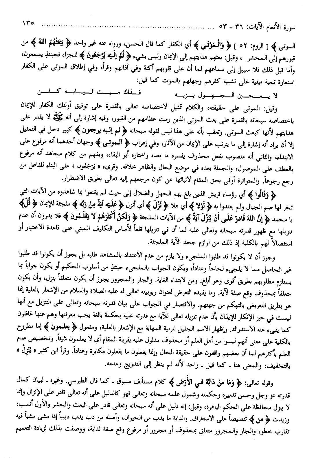 وقيل: الموتى على حقيقته، والكلام تمثيل لاختصاصه تعالى بالقدرة على توفيق أولئك الكفار للإيمان باختصاصه سبحانه بالقدرة على بعث الموتى الذين رمت عظامهم من القبور، وفيه إشارة إلى أنه صلّى الله عليه وسلّم لا يقدر على هدايتهم لأنها كبعث الموتى. وتعقب بأنه على هذا ليس لقوله سبحانه ثُمَّ إِلَيْهِ يُرْجَعُونَ كبير دخل في التمثيل إلا أن يراد أنه إشارة إلى ما يترتب على الإيمان من الآثار، وفي إعراب الْمَوْتى وجهان أحدهما أنه مرفوع على الابتداء، والثاني أنه منصوب بفعل محذوف يفسره ما بعده واختاره أبو البقاء، ويفهم من كلام مجاهد أنه مرفوع بالعطف على الموصول، والجملة بعده في موضع الحال والظاهر خلافه. وقرىء «يرجعون» على البناء للفاعل من رجع رجوعا. والمتواترة أوفى بحق المقام لانبائها عن كون مرجعهم إليه تعالى بطريق الاضطرار.