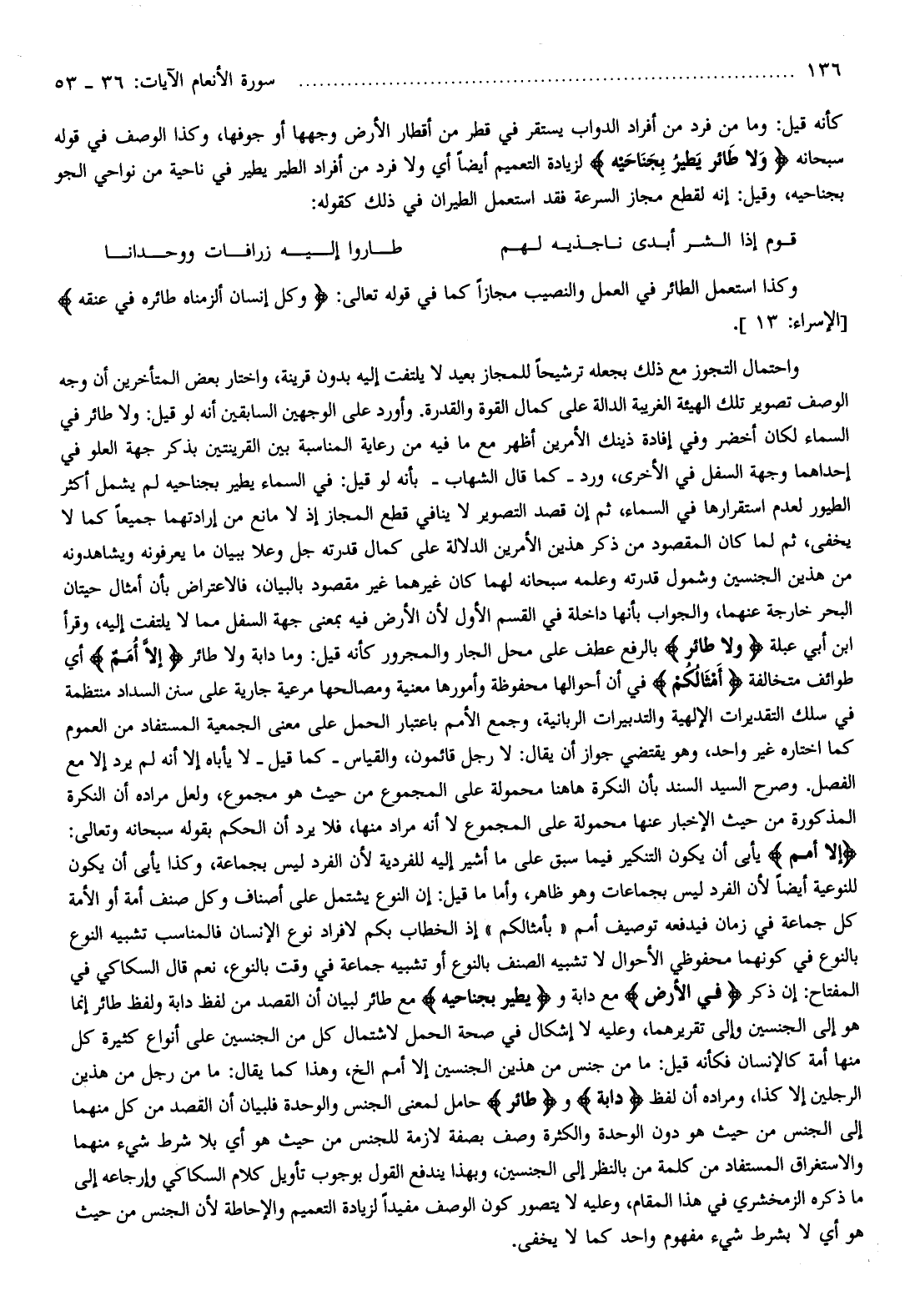 واحتمال التجوز مع ذلك بجعله ترشيحا للمجاز بعيد لا يلتفت إليه بدون قرينة، واختار بعض المتأخرين أن وجه الوصف تصوير تلك الهيئة الغريبة الدالة على كمال القوة والقدرة. وأورد على الوجهين السابقين أنه لو قيل: ولا طائر في السماء لكان أخضر وفي إفادة ذينك الأمرين أظهر مع ما فيه من رعاية المناسبة بين القرينتين بذكر جهة العلو في إحداهما وجهة السفل في الأخرى، ورد- كما قال الشهاب- بأنه لو قيل: في السماء يطير بجناحيه لم يشمل أكثر الطيور لعدم استقرارها في السماء، ثم إن قصد التصوير لا ينافي قطع المجاز إذ لا مانع من إرادتهما جميعا كما لا يخفى، ثم لما كان المقصود من ذكر هذين الأمرين الدلالة على كمال قدرته جل وعلا ببيان ما يعرفونه ويشاهدونه من هذين الجنسين وشمول قدرته وعلمه سبحانه لهما كان غيرهما غير مقصود بالبيان، فالاعتراض بأن أمثال حيتان البحر خارجة عنهما، والجواب بأنها داخلة في القسم الأول لأن الأرض فيه بمعنى جهة السفل مما لا يلتفت إليه، وقرأ ابن أبي عبلة وَلا طائِرٍ بالرفع عطف على محل الجار والمجرور كأنه قيل: وما دابة ولا طائر إِلَّا أُمَمٌ أي طوائف متخالفة أَمْثالُكُمْ في أن أحوالها محفوظة وأمورها معنية ومصالحها مرعية جارية على سنن السداد منتظمة في سلك التقديرات الإلهية والتدبيرات الربانية، وجمع الأمم باعتبار الحمل على معنى الجمعية المستفاد من العموم كما اختاره غير واحد، وهو يقتضي جواز أن يقال: لا رجل قائمون، والقياس- كما قيل- لا يأباه إلا أنه لم يرد إلا مع الفصل. وصرح السيد السند بأن النكرة هاهنا محمولة على المجموع من حيث هو مجموع، ولعل مراده أن النكرة المذكورة من حيث الإخبار عنها محمولة على المجموع لا أنه مراد منها، فلا يرد أن الحكم بقوله سبحانه وتعالى: