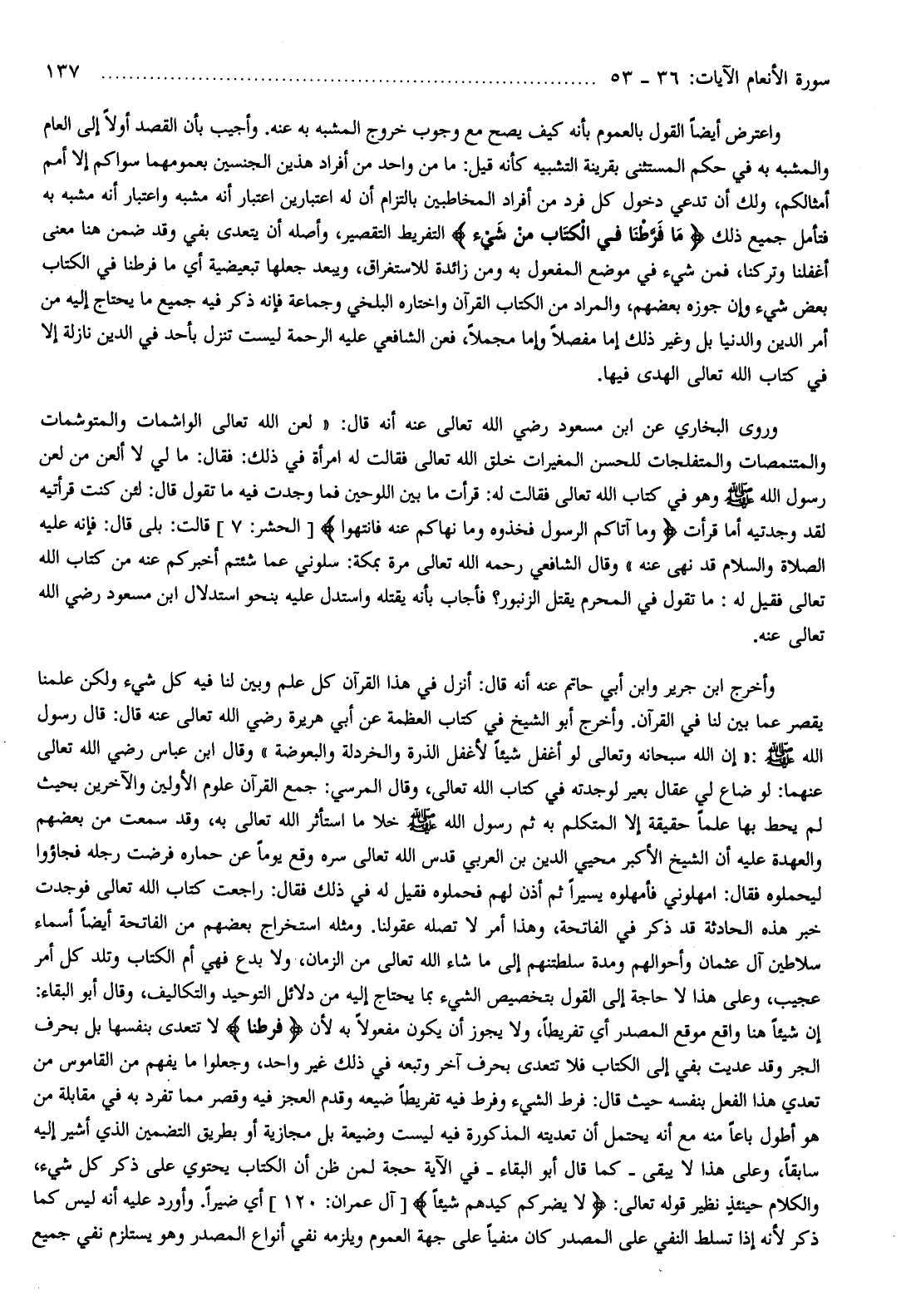 وقال ابن عباس رضي الله تعالى عنهما: لو ضاع لي عقال بعير لوجدته في كتاب الله تعالى، وقال المرسي: جمع القرآن علوم الأولين والآخرين بحيث لم يحط بها علما حقيقة إلا المتكلم به ثم رسول الله صلّى الله عليه وسلّم خلا ما استأثر الله تعالى به، وقد سمعت من بعضهم والعهدة عليه أن الشيخ الأكبر محيي الدين بن العربي قدس الله تعالى سره وقع يوما عن حماره فرضت رجله فجاؤوا ليحملوه فقال: امهلوني فأمهلوه يسيرا ثم أذن لهم فحملوه فقيل له في ذلك فقال: راجعت كتاب الله تعالى فوجدت خبر هذه الحادثة قد ذكر في الفاتحة، وهذا أمر لا تصله عقولنا. ومثله استخراج بعضهم من الفاتحة أيضا أسماء سلاطين آل عثمان وأحوالهم ومدة سلطنتهم إلى ما شاء الله تعالى من الزمان، ولا بدع فهي أم الكتاب وتلد كل أمر عجيب، وعلى هذا لا حاجة إلى القول بتخصيص الشيء بما يحتاج إليه من دلائل التوحيد والتكاليف، وقال أبو البقاء: