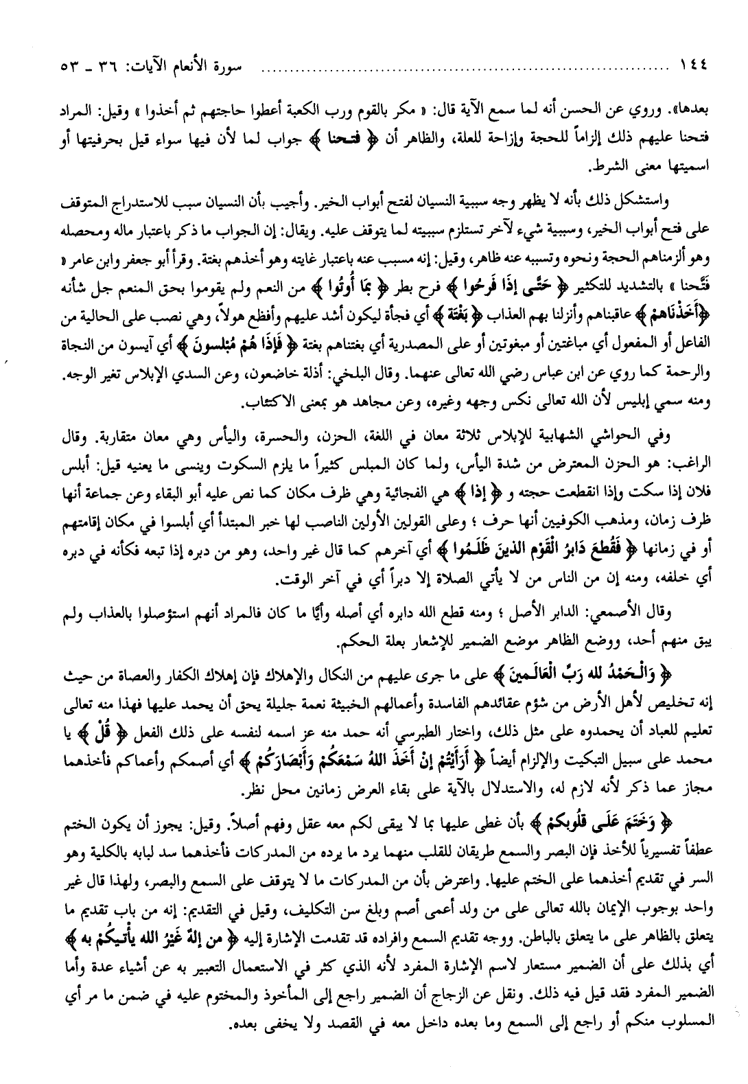 وفي الحواشي الشهابية للإبلاس ثلاثة معان في اللغة، الحزن، والحسرة، واليأس وهي معان متقاربة. وقال الراغب: هو الحزن المعترض من شدة اليأس، ولما كان المبلس كثيرا ما يلزم السكوت وينسى ما يعنيه قيل: أبلس فلان إذا سكت وإذا انقطعت حجته وإِذا هي الفجائية وهي ظرف مكان كما نص عليه أبو البقاء وعن جماعة أنها ظرف زمان، ومذهب الكوفيين أنها حرف وعلى القولين الأولين الناصب لها خبر المبتدأ أي أبلسوا في مكان إقامتهم أو في زمانها فَقُطِعَ دابِرُ الْقَوْمِ الَّذِينَ ظَلَمُوا أي آخرهم كما قال غير واحد، وهو من دبره إذا تبعه فكأنه في دبره أي خلفه، ومنه إن من الناس من لا يأتي الصلاة إلا دبرا أي في آخر الوقت.