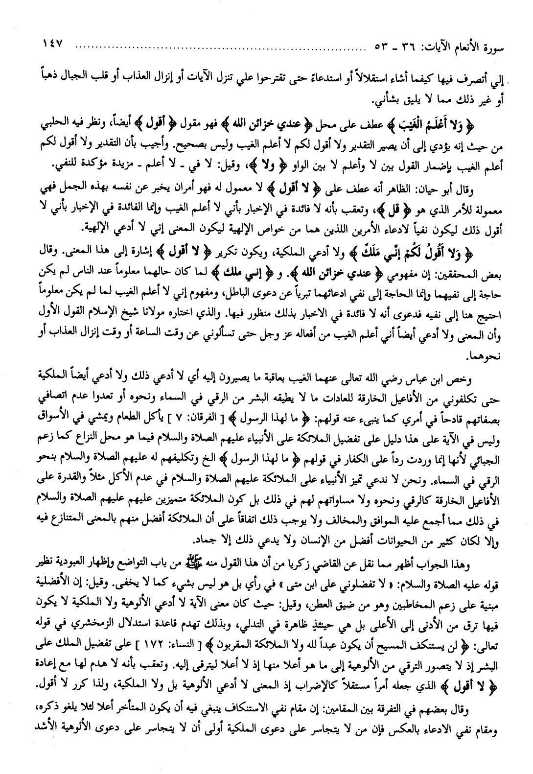 في رأي بل هو ليس بشيء كما لا يخفى. وقيل: إن الأفضلية مبنية على زعم المخاطبين وهو من ضيق العطن، وقيل: حيث كان معنى الآية لا أدعي الألوهية ولا الملكية لا يكون فيها ترق من الأدنى إلى الأعلى بل هي حينئذ ظاهرة في التدلي، وبذلك تهدم قاعدة استدلال الزمخشري في قوله تعالى: نْ يَسْتَنْكِفَ الْمَسِيحُ أَنْ يَكُونَ عَبْداً لِلَّهِ وَلَا الْمَلائِكَةُ الْمُقَرَّبُونَ
