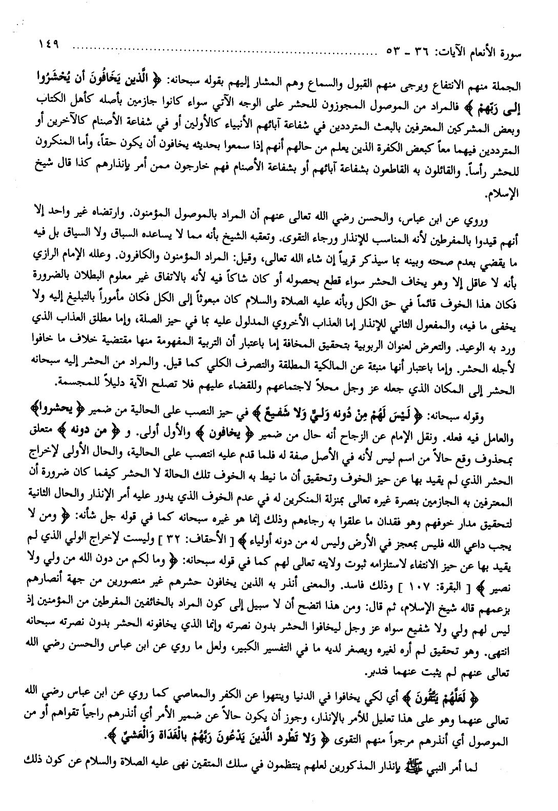 الجملة منهم الانتفاع ويرجى منهم القبول والسماع وهم المشار إليهم بقوله سبحانه: الَّذِينَ يَخافُونَ أَنْ يُحْشَرُوا إِلى رَبِّهِمْ فالمراد من الموصول المجوزون للحشر على الوجه الآتي سواء كانوا جازمين بأصله كأهل الكتاب وبعض المشركين المعترفين بالبعث المترددين في شفاعة آبائهم الأنبياء كالأولين أو في شفاعة الأصنام كالآخرين أو المترددين فيهما معا كبعض الكفرة الذين يعلم من حالهم أنهم إذا سمعوا بحديثه يخافون أن يكون حقا، وأما المنكرون للحشر رأسا. والقائلون به القاطعون بشفاعة آبائهم أو بشفاعة الأصنام فهم خارجون ممن أمر بإنذارهم كذا قال شيخ الإسلام.
