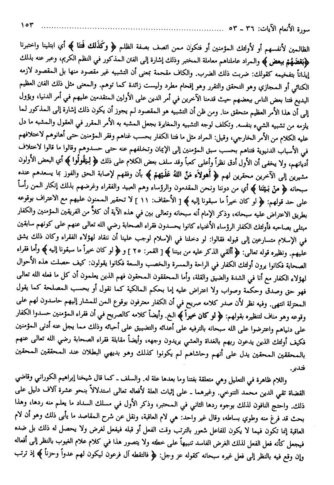 الظالمين لأنفسهم أو لأولئك المؤمنين أو فتكون ممن اتصف بصفة الظلم وَكَذلِكَ فَتَنَّا أي ابتلينا واختبرنا بَعْضَهُمْ بِبَعْضٍ والمراد عاملناهم معاملة المختبر وذلك إشارة إلى الفتن المذكور في النظم الكريم، وعبر عنه بذلك إيذانا بتفخيمه كقولك: ضربت ذلك الضرب. والكاف مقحمة بمعنى أن التشبيه غير مقصود منها بل المقصود لازمه الكنائي أو المجازي وهو التحقق والتقرر وهو إقحام مطرد وليست زائدة كما توهم. والمعنى مثل ذلك الفتن العظيم البديع فتنا بعض الناس ببعضهم حيث قدمنا الآخرين في أمر الدين على الأولين المتقدمين عليهم في أمر الدنيا، ويؤول إلى أن هذا الأمر العظيم متحقق منا. ومن ظن أن التشبيه هو المقصود لم يجوز أن يكون ذلك إشارة إلى المذكور لما يلزمه من تشبيه الشيء بنفسه. وتكلف لوجه التشبيه والمغايرة بجعل المشبه به الأمر المقرر في العقول والمشبه ما دل عليه الكلام من الأمر الخارجي، وقيل: المراد مثل ما فتنا الكفار بحسب غناهم وفقر المؤمنين حتى أهانوهم لاختلافهم في الأسباب الدنيوية فتناهم بحسب سبق المؤمنين إلى الإيمان وتخلفهم عنه حتى حسدوهم وقالوا ما قالوا لاختلاف أديانهم، ولا يخفى أن الأول أدق نظرا وأعلى كعبا وقد سلف بعض الكلام على ذلك لِيَقُولُوا أي البعض الأولون مشيرين إلى الآخرين محقرين لهم أَهؤُلاءِ مَنَّ اللَّهُ عَلَيْهِمْ بأن وفقهم لإصابة الحق والفوز بما يسعدهم عنده سبحانه مِنْ بَيْنِنا أي من دوننا ونحن المقدمون والرؤساء وهم العبيد والفقراء وغرضهم بذلك إنكار المن رأسا على حد قولهم: لَوْ كانَ خَيْراً ما سَبَقُونا إِلَيْهِ [الأحقاف: 11] لا تحقير الممنون عليهم مع الاعتراف بوقوعه بطريق الاعتراض عليه سبحانه، وذكر الإمام أنه سبحانه وتعالى بين في هذه الآية أن كلّا من الفريقين المؤمنين والكفار مبتلى بصاحبه فأولئك الكفار الرؤساء الأغنياء كانوا يحسدون فقراء الصحابة رضي الله تعالى عنهم على كونهم سابقين في الإسلام متسارعين إلى قبوله فقالوا: لو دخلنا في الإسلام لوجب علينا أن ننقاد لهؤلاء الفقراء وكان ذلك يشق عليهم. ونظيره قوله تعالى: أَأُلْقِيَ الذِّكْرُ عَلَيْهِ مِنْ بَيْنِنا [القمر: 25] ولَوْ كانَ خَيْراً ما سَبَقُونا إِلَيْهِ وأما فقراء الصحابة فكانوا يرون أولئك الكفار في الراحة والمسرة والخصب والسعة فكانوا يقولون: كيف حصلت هذه الأحوال لهؤلاء الكفار مع أنا في الشدة والضيق والقلة، وأما المحققون المحقون فهم الذين يعلمون أن كل ما فعله الله تعالى فهو حق وصدق وحكمة وصواب ولا اعتراض عليه إما بحكم المالكية كما نقول أو بحسب المصلحة كما يقول المعتزلة انتهى. وفيه نظر لأن صدر كلامه صريح في أن الكفار معترفون بوقوع المن للمشار إليهم حاسدون لهم على وقوعه وهو مناف لتنظيره بقولهم: لَوْ كانَ خَيْراً إلخ. وأيضا كلامه كالصريح في أن فقراء المؤمنين حسدوا الكفار على دنياهم واعترضوا على الله سبحانه بالترفيه على أعدائه والتضييق على أحبائه وذلك مما يجل عنه أدنى المؤمنين فكيف أولئك الذين يدعون ربهم بالغداة والعشي يريدون وجهه، وأيضا مقابلة فقراء الصحابة رضي الله تعالى عنهم بالمحققين المحقين يدل على أنهم وحاشاهم لم يكونوا كذلك وهو بديهي البطلان عند المحققين المحقين فتدبر.