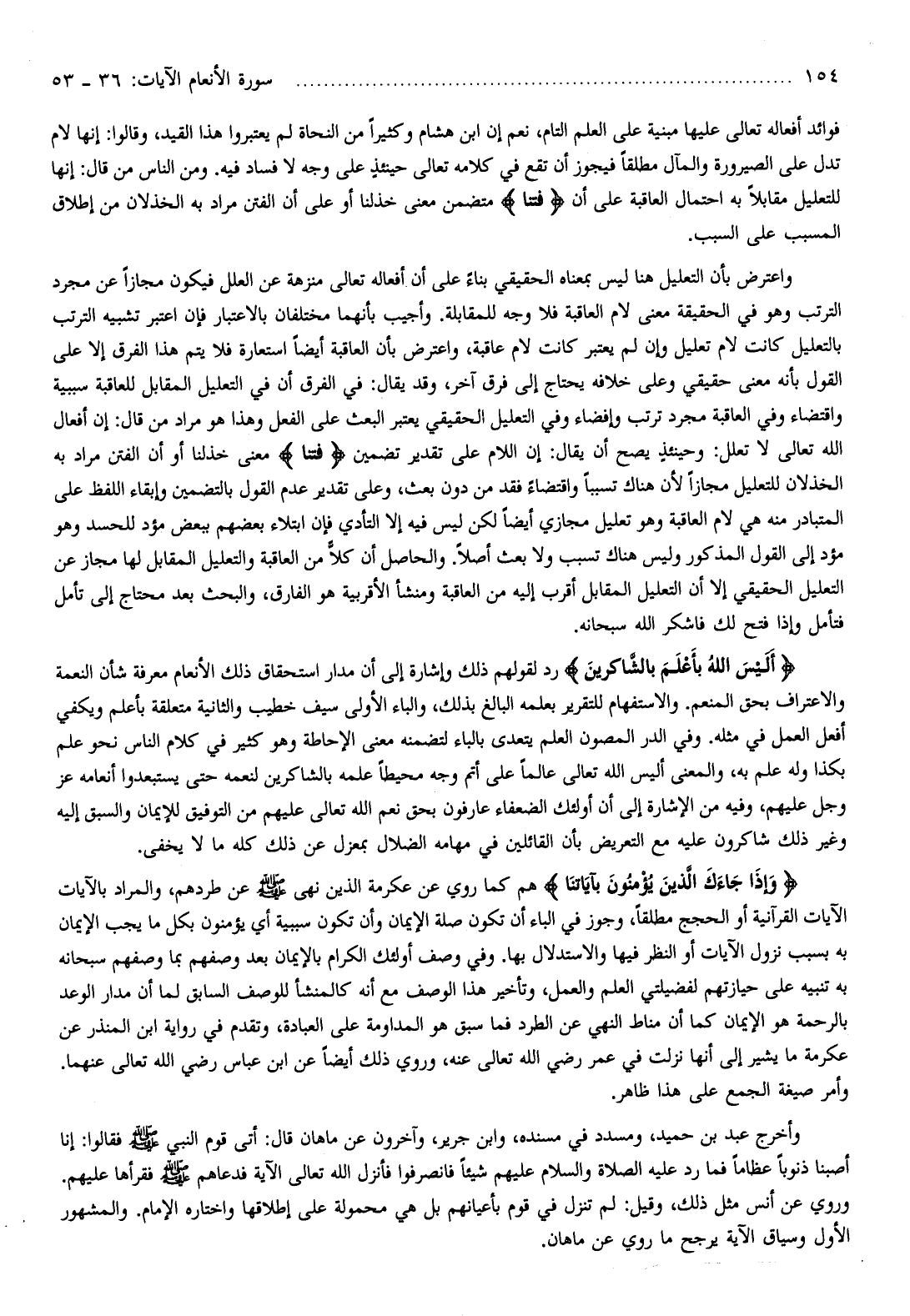 فوائد أفعاله تعالى عليها مبنية على العلم التام، نعم إن ابن هشام وكثيرا من النحاة لم يعتبروا هذا القيد، وقالوا: إنها لام تدل على الصيرورة والمآل مطلقا فيجوز أن تقع في كلامه تعالى حينئذ على وجه لا فساد فيه. ومن الناس من قال: إنها للتعليل مقابلا به احتمال العاقبة على أن فَتَنَّا متضمن معنى خذلنا أو على أن الفتن مراد به الخذلان من إطلاق المسبب على السبب.