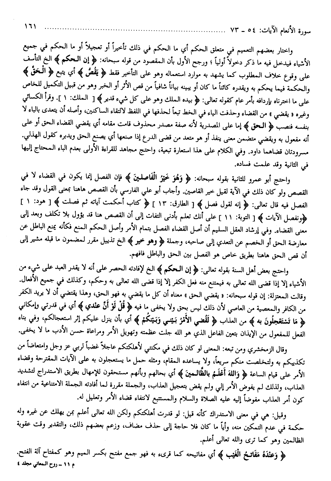 واختار بعضهم التعميم في متعلق الحكم أي ما الحكم في ذلك تأخيرا أو تعجيلا أو ما الحكم في جميع الأشياء فيدخل فيه ما ذكر دخولا أوليا ورجح الأول بأن المقصود من قوله سبحانه: إِنِ الْحُكْمُ إلخ التأسف على وقوع خلاف المطلوب كما يشهد به موارد استعماله وهو على التأخير فقط يَقُصُّ أي يتبع الْحَقَّ والحكمة فيما يحكم به ويقدره كائنا ما كان أو يبينه بيانا شافيا من قص الأثر أو الخبر وهو من قبيل التكميل للخاص على ما اخترناه بإردافه بأمر عام كقوله تعالى: بِيَدِهِ الْمُلْكُ وَهُوَ عَلى كُلِّ شَيْءٍ قَدِيرٌ [الملك: 1] . وقرأ الكسائي وغيره «يقضي» من القضاء وحذفت الياء في الخط تبعا لحذفها في اللفظ لالتقاء الساكنين، وأصله أن يتعدى بالباء لا بنفسه فنصب الْحَقَّ إما على المصدرية لأنه صفة مصدر محذوف قامت مقامه أي يقضي القضاء الحق أو على أنه مفعول به ويقضي متضمن معنى ينفذ أو هو متعد من قضى الدرع إذا صنعها أي يصنع الحق ويدبره كقول الهذلي.