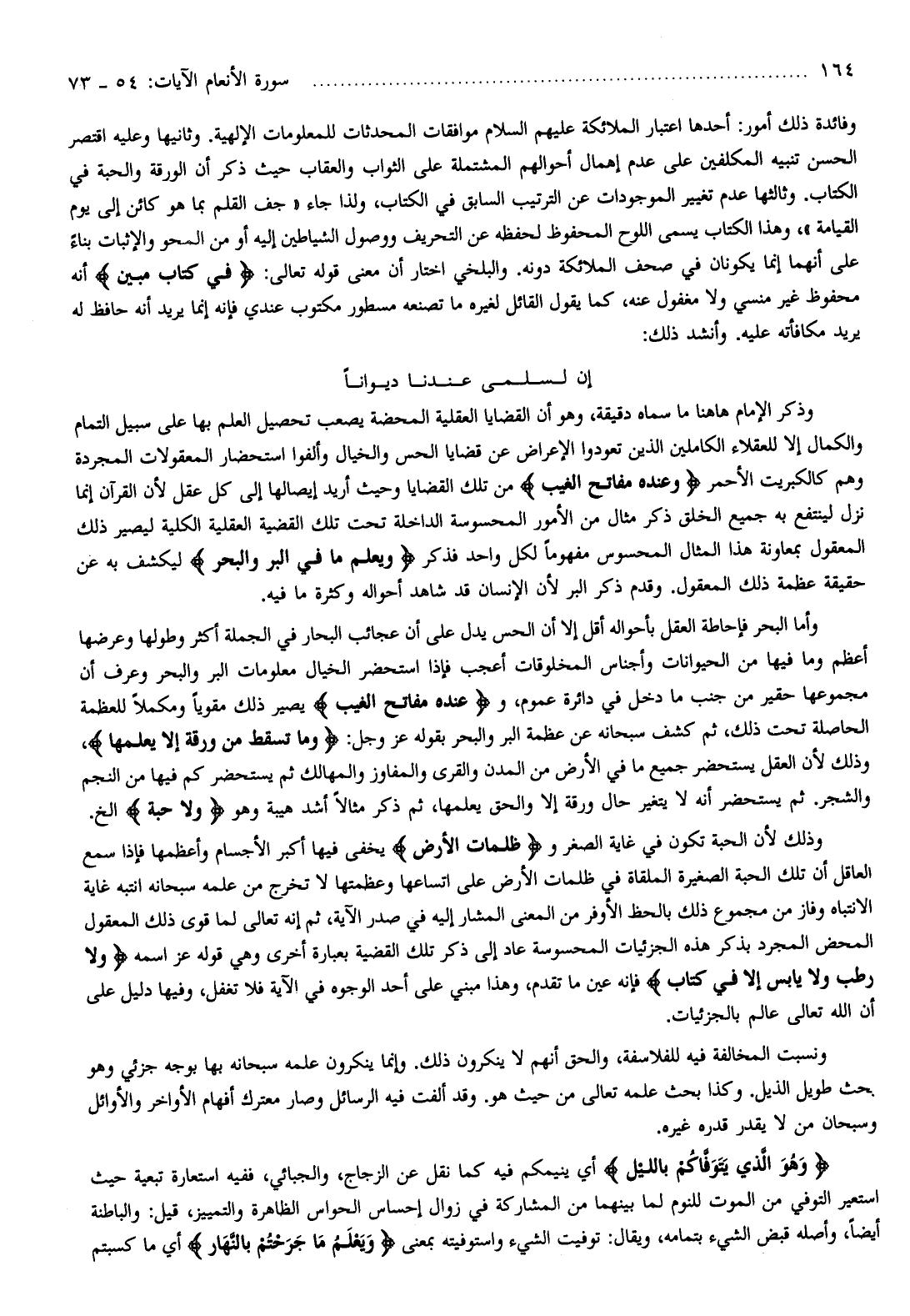 إن لسلمى عندنا ديوانا وذكر الإمام هاهنا ما سماه دقيقة، وهو أن القضايا العقلية المحضة يصعب تحصيل العلم بها على سبيل التمام والكمال إلا للعقلاء الكاملين الذين تعودوا الإعراض عن قضايا الحس والخيال وألفوا استحضار المعقولات المجردة وهم كالكبريت الأحمر وَعِنْدَهُ مَفاتِحُ الْغَيْبِ من تلك القضايا وحيث أريد إيصالها إلى كل عقل لأن القرآن إنما نزل لينتفع به جميع الخلق ذكر مثال من الأمور المحسوسة الداخلة تحت تلك القضية العقلية الكلية ليصير ذلك المعقول بمعاونة هذا المثال المحسوس مفهوما لكل واحد فذكر وَيَعْلَمُ ما فِي الْبَرِّ وَالْبَحْرِ ليكشف به عن حقيقة عظمة ذلك المعقول. وقدم ذكر البر لأن الإنسان قد شاهد أحواله وكثرة ما فيه.