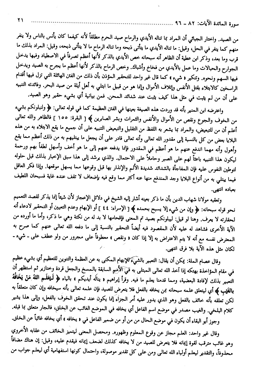 وقال عصام الملة: يمكن أن يقال: التعبير بالشيء للإبهام المكنى به عن العظمة والتنوين للتعظيم أي بشيء عظيم في مقام المؤاخذة بهتكه إذا آخذ الله تعالى المبتلى به في الأمم السابقة بالمسخ والجعل قردة وخنازير ثم استظهر أن التعبير بذلك لإفادة البعضية، ومما قدمنا يعلم ما فيه. وقرأ إبراهيم «يناله أيديكم» بالياء لِيَعْلَمَ اللَّهُ مَنْ يَخافُهُ بِالْغَيْبِ أي ليتعلق عمله سبحانه بمن يخافه بالفعل فلا يتعرض للصيد فإن علمه تعالى بأنه سيخافه وإن كان متعلقا به لكن تعلقه بأنه خائف بالفعل وهو الذي يدور عليه أمر الجزاء إنما يكون عند تحقق الخوف بالفعل، وإلى هذا يشير كلام البلخي. والغيب مصدر في موضع اسم الفاعل أي يخافه في الموضع الغائب عن الخلق، فالجار متعلق بما قبله.
