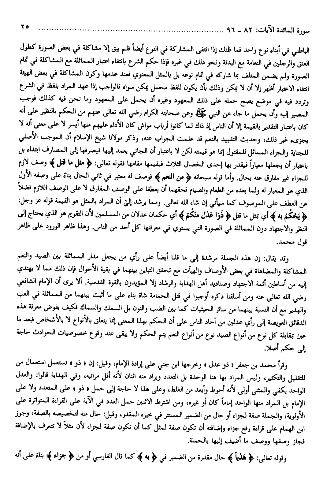 الباطني في أبناء نوع واحد فما ظنك إذا انتفى المشاركة في النوع أيضا فلم يبق إلا مشاكلة في بعض الصورة كطول العنق والرجلين في النعامة مع البدنة ونحو ذلك في غيره فإذا حكم الشرع بانتفاء اعتبار المماثلة مع المشاكلة في تمام الصورة ولم يضمن المتلف بما شاركه في تمام نوعه بل بالمثل المعنوي فعند عدمها وكون المشاكلة في بعض الهيئة انتفاء الاعتبار أظهر إلا أن لا يمكن وذلك بأن يكون للفظ محمل يمكن سواه فالواجب إذا عهد المراد بلفظ في الشرع وتردد فيه في موضع يصح حمله على ذلك المعهود وغيره أن يحمل على المعهود وما نحن فيه كذلك فوجب المصير إليه وأن يحمل ما جاء عن النبي صلّى الله عليه وسلّم وعن صحابته الكرام رضي الله تعالى عنهم من الحكم بالنظير على أنه كان باعتبار التقدير بالقيمة إلا أن الناس إذ ذاك لما كانوا أرباب مواش كان الأداء عليهم منها أيسر لا على معنى أنه لا يجزىء غير ذلك، وحديث التقييد بالنعم قد علمت الجواب عنه، وذكر مولانا شيخ الإسلام أن الموجب الأصلي للجناية والجزاء المماثل للمقتول إنما هو قيمته لكن لا باعتبار أن الجاني يعمد إليها فيصرفها إلى المصارف ابتداء بل باعتبار أن يجعلها معيارا فيقدر بها إحدى الخصال الثلاث فيقيمها مقامها فقوله تعالى: مِثْلُ ما قَتَلَ وصف لازم للجزاء غير مفارق عنه بحال. وأما قوله سبحانه مِنَ النَّعَمِ فوصف له معتبر في ثاني الحال بناء على وصفه الأول الذي هو المعيار له ولما بعده من الطعام والصيام فحقهما أن يعطفا على الوصف المفارق لا على الوصف اللازم فضلا عن العطف على الموصوف كما سيأتي إن شاء الله تعالى. ومما يرشد إلى أن المراد بالمثل هو القيمة قوله عز وجل: