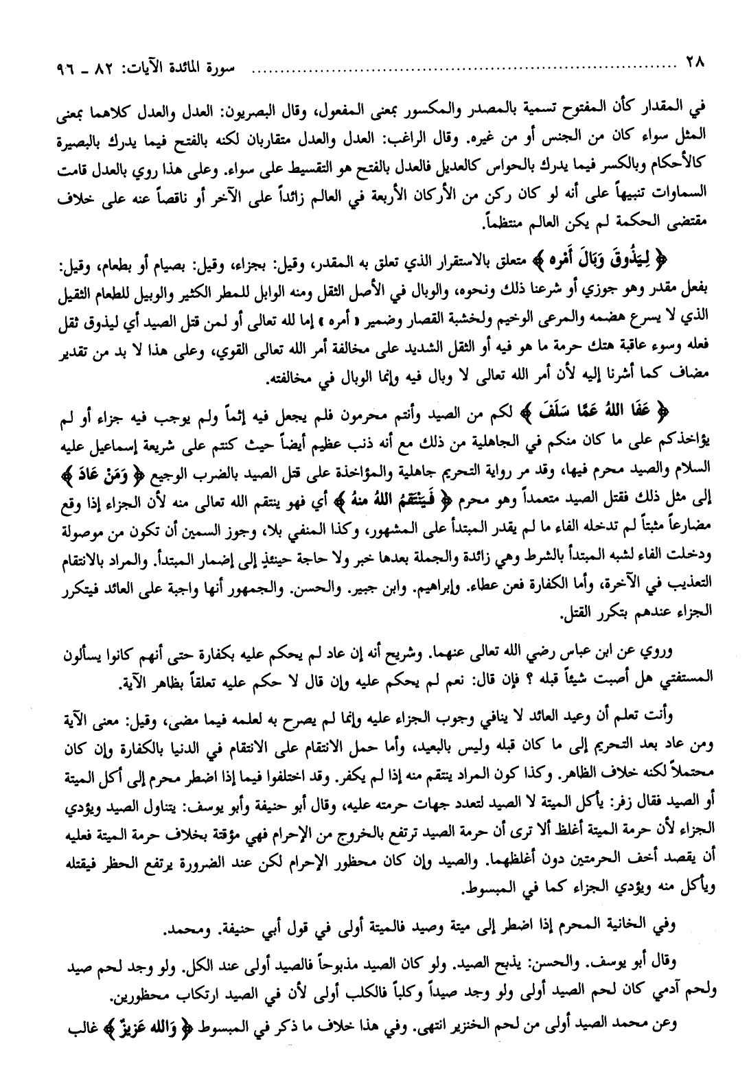 وأنت تعلم أن وعيد العائد لا ينافي وجوب الجزاء عليه وإنما لم يصرح به لعلمه فيما مضى، وقيل: معنى الآية ومن عاد بعد التحريم إلى ما كان قبله وليس بالبعيد، وأما حمل الانتقام على الانتقام في الدنيا بالكفارة وإن كان محتملا لكنه خلاف الظاهر. وكذا كون المراد ينتقم منه إذا لم يكفر. وقد اختلفوا فيما إذا اضطر محرم إلى أكل الميتة أو الصيد فقال زفر: يأكل الميتة لا الصيد لتعدد جهات حرمته عليه، وقال أبو حنيفة وأبو يوسف: يتناول الصيد ويؤدي الجزاء لأن حرمة الميتة أغلظ ألا ترى أن حرمة الصيد ترتفع بالخروج من الإحرام فهي مؤقتة بخلاف حرمة الميتة فعليه أن يقصد أخف الحرمتين دون أغلظهما. والصيد وإن كان محظور الإحرام لكن عند الضرورة يرتفع الحظر فيقتله ويأكل منه ويؤدي الجزاء كما في المبسوط.