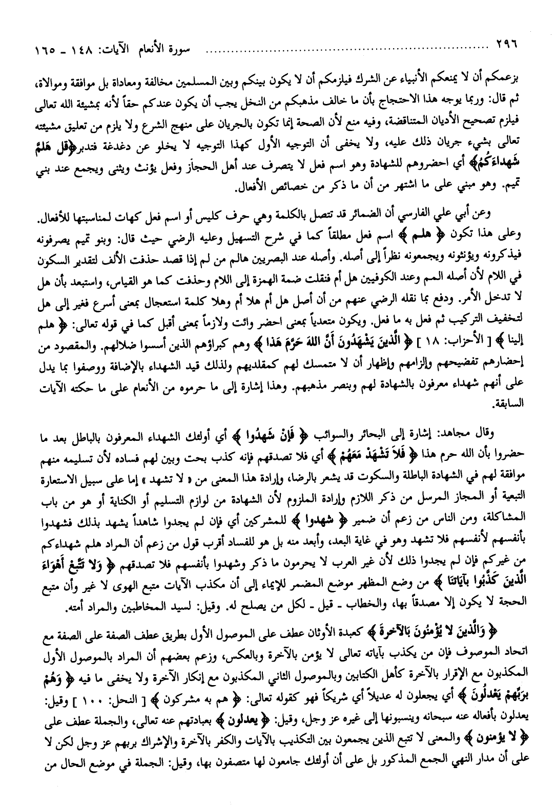 وعلى هذا تكون هَلُمَّ اسم فعل مطلقا كما في شرح التسهيل وعليه الرضي حيث قال: وبنو تميم يصرفونه فيذكرونه ويؤنثونه ويجمعونه نظرا إلى أصله. وأصله عند البصريين هالم من لم إذا قصد حذفت الألف لتقدير السكون في اللام لأن أصله المم وعند الكوفيين هل أم فنقلت ضمة الهمزة إلى اللام وحذفت كما هو القياس، واستبعد بأن هل لا تدخل الأمر. ودفع بما نقله الرضي عنهم من أن أصل هل أم هلا أم وهلا كلمة استعجال بمعنى أسرع فغير إلى هل لتخفيف التركيب ثم فعل به ما فعل. ويكون متعديا بمعنى احضر وائت ولازما بمعنى أقبل كما في قوله تعالى: هَلُمَّ إِلَيْنا [الأحزاب: 18] الَّذِينَ يَشْهَدُونَ أَنَّ اللَّهَ حَرَّمَ هذا وهم كبراؤهم الذين أسسوا ضلالهم. والمقصود من إحضارهم تفضيحهم وإلزامهم وإظهار أن لا متمسك لهم كمقلديهم ولذلك قيد الشهداء بالإضافة ووصفوا بما يدل على أنهم شهداء معرفون بالشهادة لهم وبنصر مذهبهم. وهذا إشارة إلى ما حرموه من الأنعام على ما حكته الآيات السابقة.