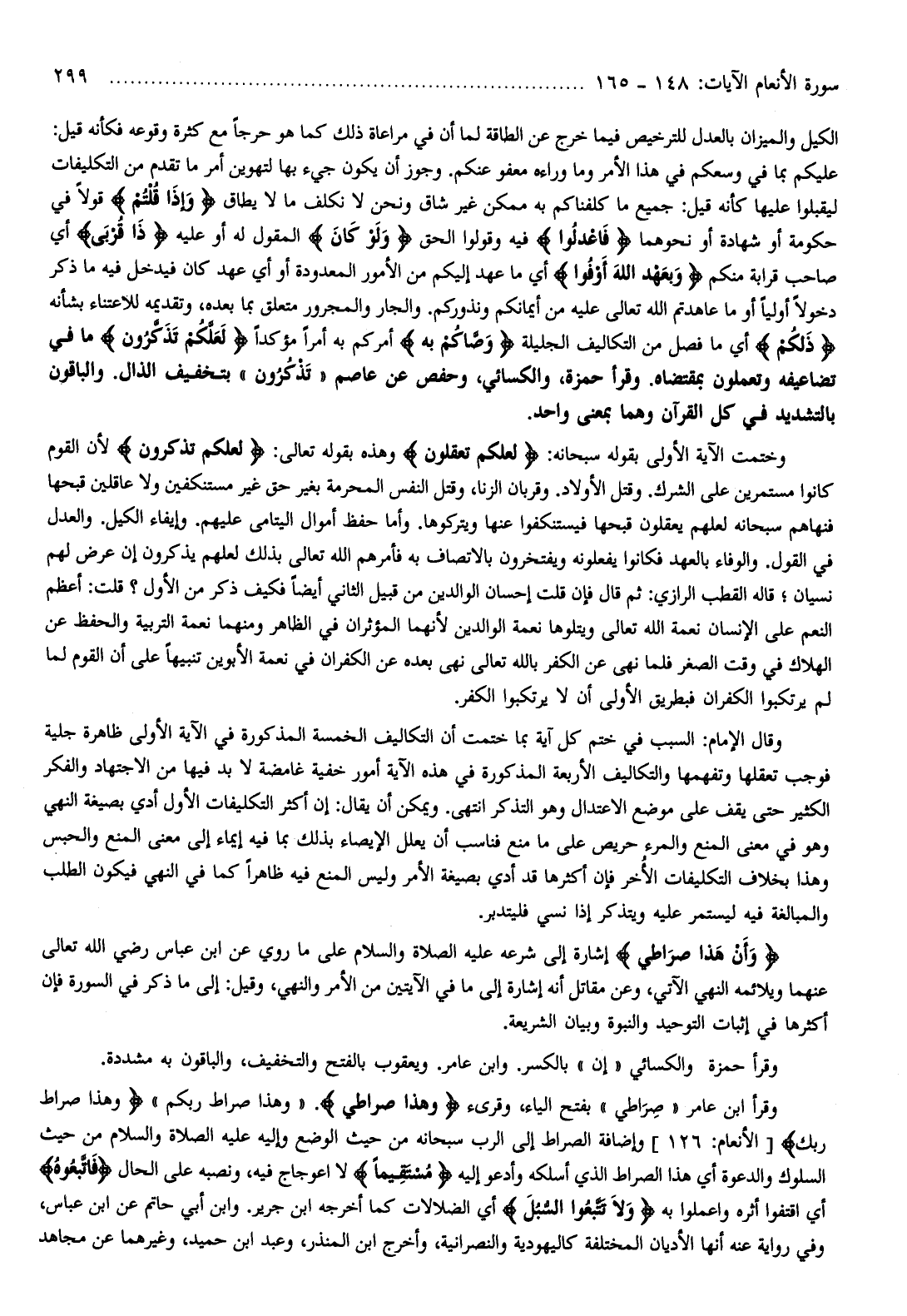 وقرأ ابن عامر «صراطي» بفتح الياء، وقرىء وهذا صِراطِي. «وهذا صراط ربكم» وَهذا صِراطُ رَبِّكَ [الأنعام: 126] وإضافة الصراط إلى الرب سبحانه من حيث الوضع وإليه عليه الصلاة والسلام من حيث السلوك والدعوة أي هذا الصراط الذي أسلكه وأدعو إليه مُسْتَقِيماً لا اعوجاج فيه، ونصبه على الحال فَاتَّبِعُوهُ أي اقتفوا أثره واعملوا به وَلا تَتَّبِعُوا السُّبُلَ أي الضلالات كما أخرجه ابن جرير. وابن أبي حاتم عن ابن عباس، وفي رواية عنه أنها الأديان المختلفة كاليهودية والنصرانية، وأخرج ابن المنذر، وعبد ابن حميد، وغيرهما عن مجاهد