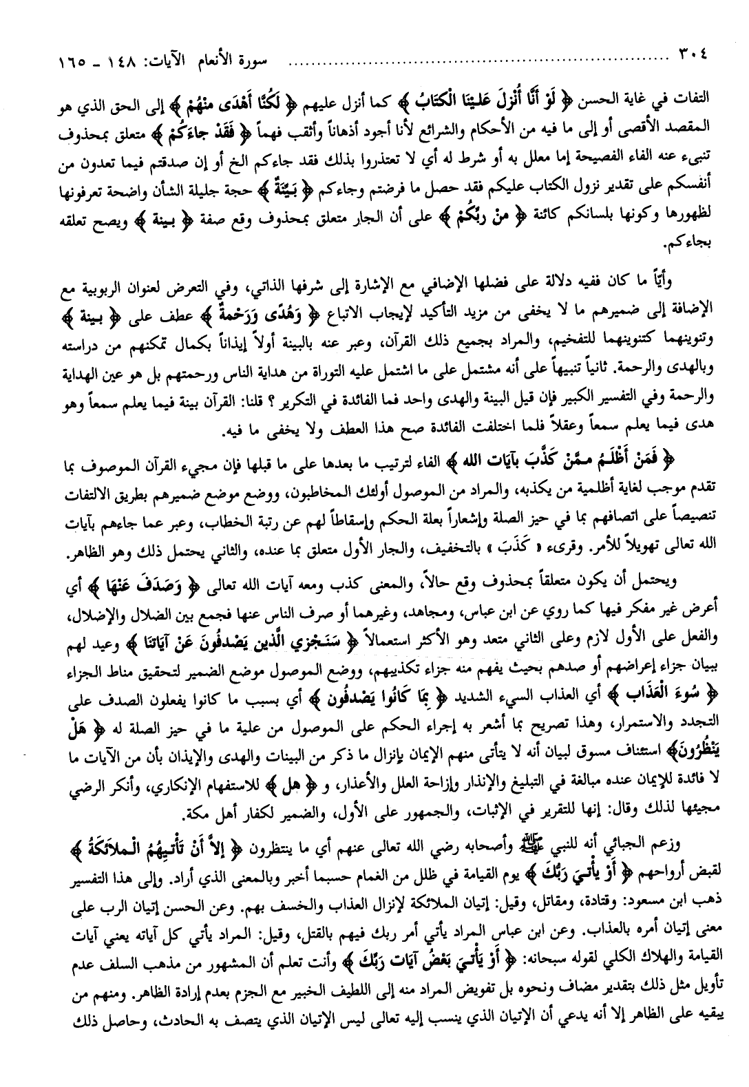 ويحتمل أن يكون متعلقا بمحذوف وقع حالا، والمعنى كذب ومعه آيات الله تعالى وَصَدَفَ عَنْها أي أعرض غير مفكر فيها كما روي عن ابن عباس، ومجاهد، وغيرهما أو صرف الناس عنها فجمع بين الضلال والإضلال، والفعل على الأول لازم وعلى الثاني متعد وهو الأكثر استعمالا سَنَجْزِي الَّذِينَ يَصْدِفُونَ عَنْ آياتِنا وعيد لهم ببيان جزاء إعراضهم أو صدهم بحيث يفهم منه جزاء تكذيبهم، ووضع الموصول موضع الضمير لتحقيق مناط الجزاء سُوءَ الْعَذابِ أي العذاب السيء الشديد بِما كانُوا يَصْدِفُونَ أي بسبب ما كانوا يفعلون الصدف على التجدد والاستمرار، وهذا تصريح بما أشعر به إجراء الحكم على الموصول من علية ما في حيز الصلة له هَلْ يَنْظُرُونَ استئناف مسوق لبيان أنه لا يتأتى منهم الإيمان بإنزال ما ذكر من البينات والهدى والإيذان بأن من الآيات ما لا فائدة للإيمان عنده مبالغة في التبليغ والإنذار وإزاحة العلل والأعذار، وهَلْ للاستفهام الإنكاري، وأنكر الرضي مجيئها لذلك وقال: إنها للتقرير في الإثبات، والجمهور على الأول، والضمير لكفار أهل مكة.