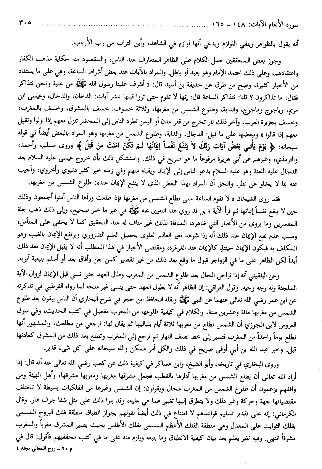 وعن البلقيني أنه إذا تراخى الحال بعد طلوع الشمس من المغرب وطال العهد حتى نسي قبل الإيمان لزوال الآية الملجئة وله وجه وجيه. وقول العراقي: إن الظاهر أنه لا يطول العهد حتى ينسى غير متجه لما رواه القرطبي في تذكرته عن ابن عمر رضي الله تعالى عنهما عن النبي صلّى الله عليه وسلّم ونقله الحافظ ابن حجر في شرح البخاري أن الناس يبقون بعد طلوع الشمس من مغربها مائة وعشرين سنة، والكلام في كيفية طلوعها من المغرب مفصل في كتب الحديث، وفي سوق العروس لابن الجوزي أن الشمس تطلع من مغربها ثلاثة أيام بلياليها ثم يقال لها: ارجعي من مطلعك، والمشهور أنها تطلع يوما واحدا من المغرب فتسير إلى خط نصف النهار ثم ترجع إلى المغرب وتطلع بعد ذلك من المشرق كعادتها قبل. وخبر عبد الله بن أبي أوفى صريح في ذلك والكل أمر ممكن والله سبحانه على كل شيء قدير.