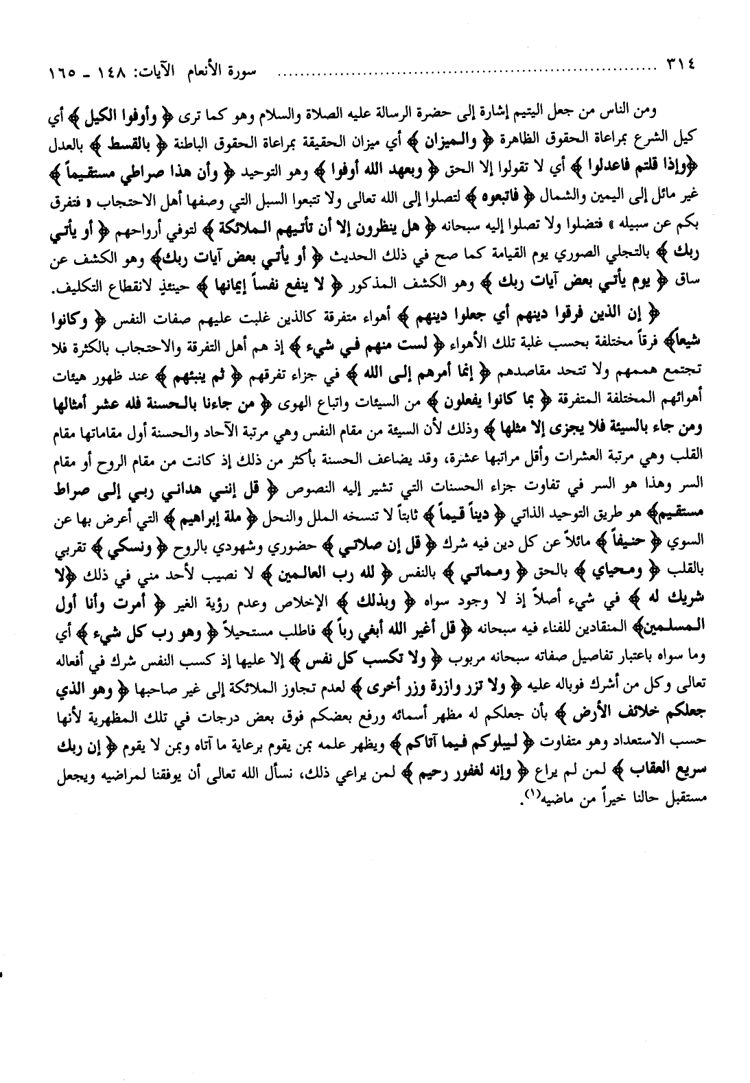 إِنَّ الَّذِينَ فَرَّقُوا دِينَهُمْ أي جعلوا دينهم أهواء متفرقة كالذين غلبت عليهم صفات النفس وَكانُوا شِيَعاً فرقا مختلفة بحسب غلبة تلك الأهواء لَسْتَ مِنْهُمْ فِي شَيْءٍ إذ هم أهل التفرقة والاحتجاب بالكثرة فلا تجتمع هممهم ولا تتحد مقاصدهم إِنَّما أَمْرُهُمْ إِلَى اللَّهِ في جزاء تفرقهم ثُمَّ يُنَبِّئُهُمْ عند ظهور هيئات أهوائهم المختلفة المتفرقة بِما كانُوا يَفْعَلُونَ من السيئات واتباع الهوى مَنْ جاءَ بِالْحَسَنَةِ فَلَهُ عَشْرُ أَمْثالِها وَمَنْ جاءَ بِالسَّيِّئَةِ فَلا يُجْزى إِلَّا مِثْلَها وذلك لأن السيئة من مقام النفس وهي مرتبة الآحاد والحسنة أول مقاماتها مقام القلب وهي مرتبة العشرات وأقل مراتبها عشرة، وقد يضاعف الحسنة بأكثر من ذلك إذ كانت من مقام الروح أو مقام السر وهذا هو السر في تفاوت جزاء الحسنات التي تشير إليه النصوص قُلْ إِنَّنِي هَدانِي رَبِّي إِلى صِراطٍ مُسْتَقِيمٍ هو طريق التوحيد الذاتي دِيناً قِيَماً ثابتا لا تنسخه الملل والنحل مِلَّةَ إِبْراهِيمَ التي أعرض بها عن السوي حَنِيفاً مائلا عن كل دين فيه شرك قُلْ إِنَّ صَلاتِي حضوري وشهودي بالروح وَنُسُكِي تقربي بالقلب وَمَحْيايَ بالحق وَمَماتِي بالنفس لِلَّهِ رَبِّ الْعالَمِينَ لا نصيب لأحد مني في ذلك لا شَرِيكَ لَهُ في شيء أصلا إذ لا وجود سواه وَبِذلِكَ الإخلاص وعدم رؤية الغير أُمِرْتُ وَأَنَا أَوَّلُ الْمُسْلِمِينَ المنقادين للفناء فيه سبحانه قُلْ أَغَيْرَ اللَّهِ أَبْغِي رَبًّا فاطلب مستحيلا وَهُوَ رَبُّ كُلِّ شَيْءٍ أي وما سواه باعتبار تفاصيل صفاته سبحانه مربوب وَلا تَكْسِبُ كُلُّ نَفْسٍ إلا عليها إذ كسب النفس شرك في أفعاله تعالى وكل من أشرك فوباله عليه وَلا تَزِرُ وازِرَةٌ وِزْرَ أُخْرى لعدم تجاوز الملائكة إلى غير صاحبها وَهُوَ الَّذِي جَعَلَكُمْ خَلائِفَ الْأَرْضِ بأن جعلكم له مظهر أسمائه ورفع بعضكم فوق بعض درجات في تلك المظهرية لأنها حسب الاستعداد وهو متفاوت لِيَبْلُوَكُمْ فِي ما آتاكُمْ ويظهر علمه بمن يقوم برعاية ما آتاه وبمن لا يقوم إِنَّ رَبَّكَ سَرِيعُ الْعِقابِ لمن لم يراع وَإِنَّهُ لَغَفُورٌ رَحِيمٌ لمن يراعي ذلك، نسأل الله تعالى أن يوفقنا لمراضيه ويجعل مستقبل حالنا خيرا من ماضيه. (¬1)