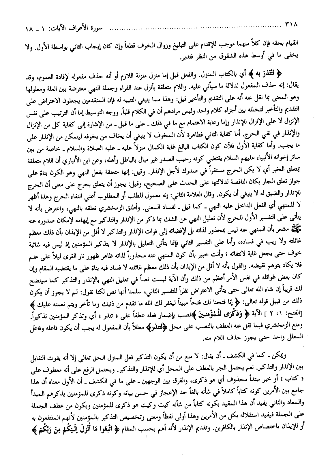 لِتُنْذِرَ بِهِ أي بالكتاب المنزل. والفعل قيل إما منزل منزلة اللازم أو أنه حذف مفعوله لإفادة العموم، وقد يقال: إنه حذف المفعول لدلالة ما سيأتي عليه. واللام متعلقة بأنزل عند الفراء وجملة النهي معترضة بين العلة ومعلولها وهو المعنى بما نقل عنه أنه على التقديم والتأخير قيل: وهذا مما ينبغي التنبيه له فإن المتقدمين يجعلون الاعتراض على التقديم والتأخير لتخلله بين أجزاء كلام واحد وليس مرادهم أن في الكلام قلبا. ووجه التوسيط إما أن الترتيب على نفس الإنزال لا على الإنزال للإنذار وإما رعاية الاهتمام مع ما في ذلك- على ما قيل- من الإشارة إلى كفاية كل من الإنزال والإنذار في نفي الحرج. أما كفاية الثاني فظاهرة لأن المخوف لا ينبغي أن يخاف من يخوفه ليتمكن من الإنذار على ما يجب. وأما كفاية الأول فلأن كون الكتاب البالغ غاية الكمال منزلا عليه- عليه الصلاة والسلام- خاصة من بين سائر إخوانه الأنبياء عليهم السلام يقتضي كونه رحيب الصدر غير مبال بالباطل وأهله، وعن ابن الأنباري أن اللام متعلقة بمتعلق الخبر أي لا يكن الحرج مستقرا في صدرك لأجل الإنذار. وقيل: إنها متعلقة بفعل النهي وهو الكون بناء على جواز تعلق الجار بكان الناقصة لدلالتها على الحدث على الصحيح، وقيل: يجوز أن يتعلق بحرج على معنى أن الحرج للإنذار والضيق له لا ينبغي أن يكون. وقال العلامة الثاني: إنه معمول للطلب أو المطلوب أعني انتفاء الحرج وهذا أظهر لا للمنهي أي الفعل الداخل عليه النهي- كما قيل- لفساد المعنى. وأطلق الزمخشري تعلقه بالنهي، واعترض بأنه لا يتأتى على التفسير الأول للحرج لأن تعليل النهي عن الشك بما ذكر من الإنذار والتذكير مع إيهامه لإمكان صدوره عنه صلّى الله عليه وسلّم مشعر بأن المنهي عنه ليس بمحذور لذاته بل لإفضائه إلى فوات الإنذار والتذكير لا أقل من الإيذان بأن ذلك معظم غائلته ولا ريب في فساده، وأما على التفسير الثاني فإنما يتأتى التعليل بالإنذار لا بتذكير المؤمنين إذ ليس فيه شائبة خوف حتى يجعل غاية لانتفائه وأنت خبير بأن كون المنهي عنه محذورا لذاته ظاهر ظهور نار القرى ليلا على علم فلا يكاد يتوهم نقيضه. والقول بأنه لا أقل من الإيذان بأن ذلك معظم غائلته لا فساد فيه بناء على ما يقتضيه المقام وإن كان بعض غوائله في نفس الأمر أعظم من ذلك وأن الآية ليست نصا في تعليل النهي بالإنذار والتذكير كما سيتضح لك قريبا إن شاء الله تعالى حتى يتأتى الاعتراض نظرا للتفسير الثاني، سلمنا أنها نص لكنا نقول: لم لا يجوز أن يكون ذلك من قبيل قوله تعالى: إِنَّا فَتَحْنا لَكَ فَتْحاً مُبِيناً لِيَغْفِرَ لَكَ اللَّهُ ما تَقَدَّمَ مِنْ ذَنْبِكَ وَما تَأَخَّرَ وَيُتِمَّ نِعْمَتَهُ عَلَيْكَ [الفتح: 1، 2] الآية وَذِكْرى لِلْمُؤْمِنِينَ نصب بإضمار فعله عطفا على «تنذر» أي وتذكر المؤمنين تذكيرا.