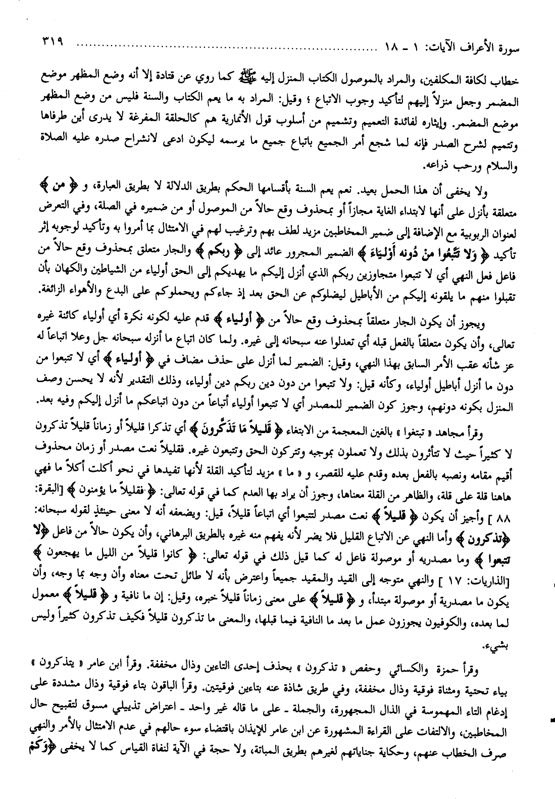تَذَكَّرُونَ وأما النهي عن الاتباع القليل فلا يضر لأنه يفهم منه غيره بالطريق البرهاني، وأن يكون حالا من فاعل لا تَتَّبِعُوا وما مصدريه أو موصولة فاعل له كما قيل ذلك في قوله تعالى: كانُوا قَلِيلًا مِنَ اللَّيْلِ ما يَهْجَعُونَ [الذاريات: 17] والنهي متوجه إلى القيد والمقيد جميعا واعترض بأنه لا طائل تحت معناه وأن وجه بما وجه، وأن يكون ما مصدرية أو موصولة مبتدأ، وقَلِيلًا على معنى زمانا قليلا خبره، وقيل: إن ما نافية وقَلِيلًا معمول لما بعده، والكوفيون يجوزون عمل ما بعد ما النافية فيما قبلها، والمعنى ما تذكرون قليلا فكيف تذكرون كثيرا وليس بشيء.