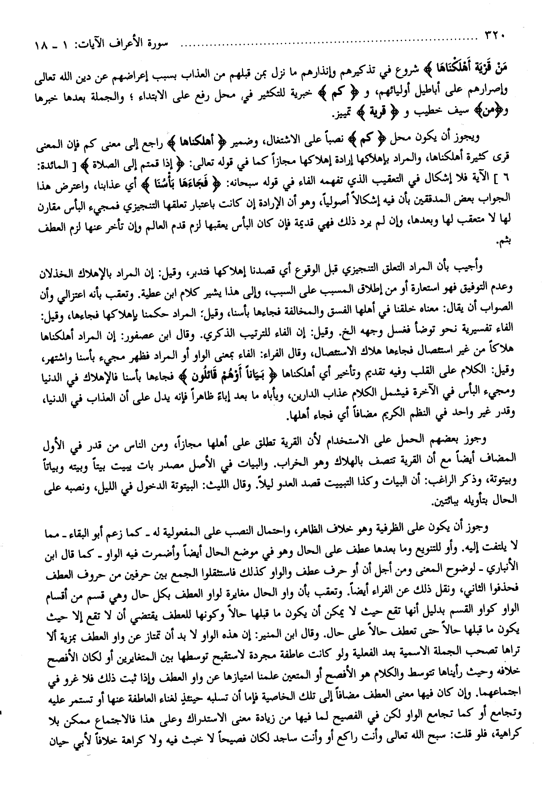 ويجوز أن يكون محل كَمْ نصبا على الاشتغال، وضمير أَهْلَكْناها راجع إلى معنى كم فإن المعنى قرى كثيرة أهلكناها، والمراد بإهلاكها إرادة إهلاكها مجازا كما في قوله تعالى: إِذا قُمْتُمْ إِلَى الصَّلاةِ [المائدة: