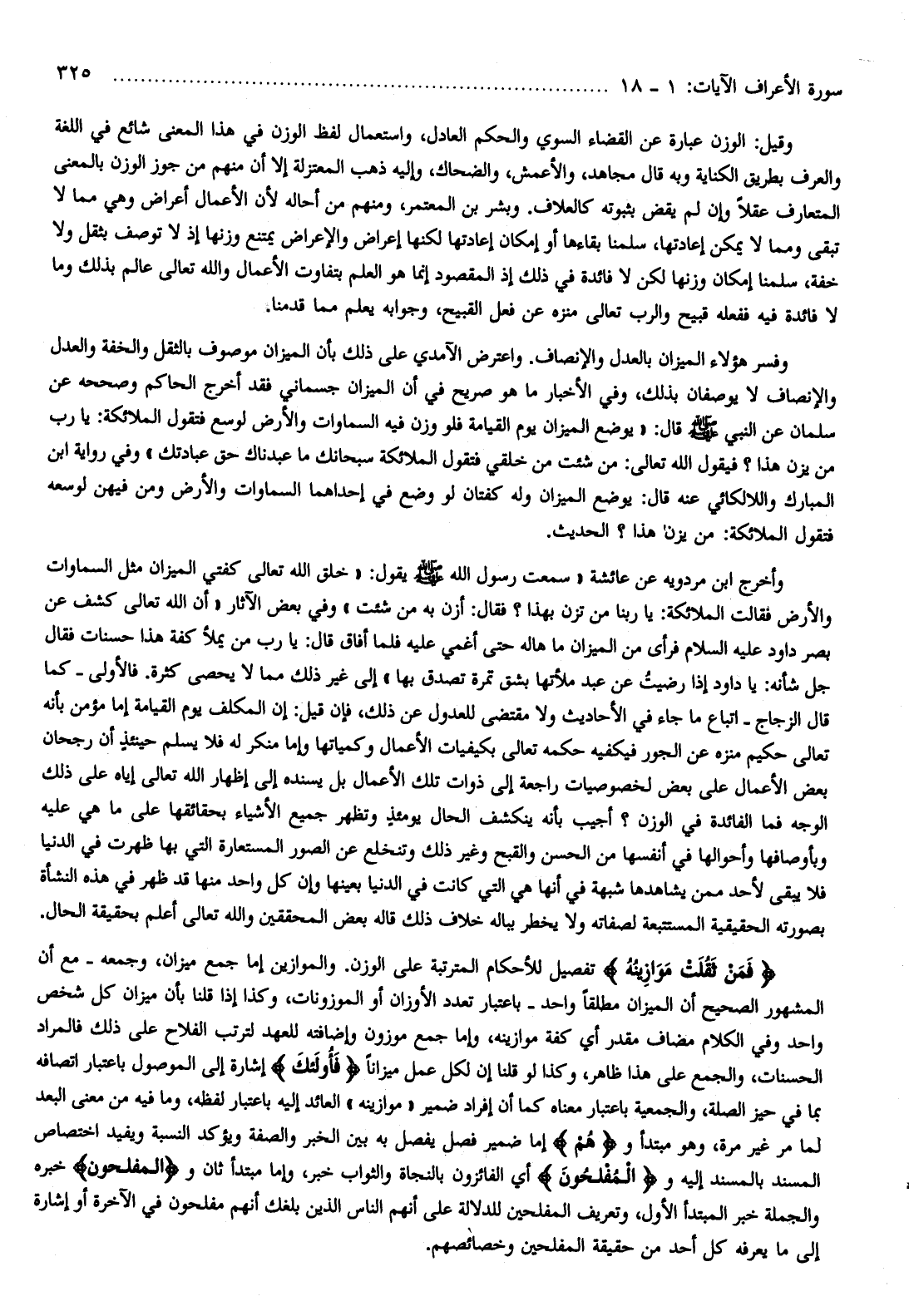 وقيل: الوزن عبارة عن القضاء السوي والحكم العادل، واستعمال لفظ الوزن في هذا المعنى شائع في اللغة والعرف بطريق الكناية وبه قال مجاهد، والأعمش، والضحاك، وإليه ذهب المعتزلة إلا أن منهم من جوز الوزن بالمعنى المتعارف عقلا وإن لم يقض بثبوته كالعلاف. وبشر بن المعتمر، ومنهم من أحاله لأن الأعمال أعراض وهي مما لا تبقى ومما لا يمكن إعادتها، سلمنا بقاءها أو إمكان إعادتها لكنها إعراض والإعراض يمتنع وزنها إذ لا توصف بثقل ولا خفة، سلمنا إمكان وزنها لكن لا فائدة في ذلك إذ المقصود إنما هو العلم بتفاوت الأعمال والله تعالى عالم بذلك وما لا فائدة فيه ففعله قبيح والرب تعالى منزه عن فعل القبيح، وجوابه يعلم مما قدمنا.