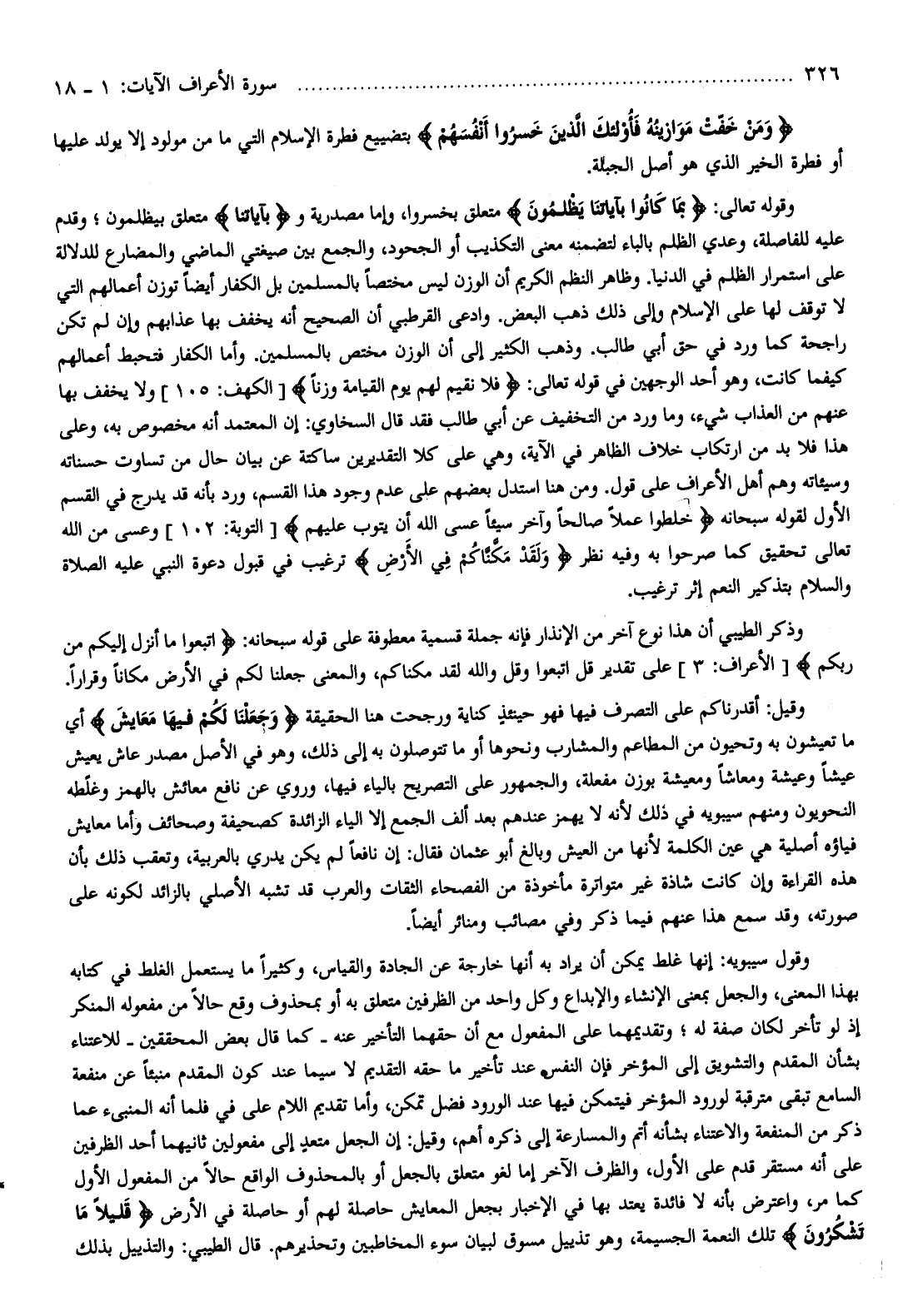 وقوله تعالى: بِما كانُوا بِآياتِنا يَظْلِمُونَ متعلق بخسروا، وإما مصدرية وبِآياتِنا متعلق بيظلمون وقدم عليه للفاصلة، وعدي الظلم بالباء لتضمنه معنى التكذيب أو الجحود، والجمع بين صيغتي الماضي والمضارع للدلالة على استمرار الظلم في الدنيا. وظاهر النظم الكريم أن الوزن ليس مختصا بالمسلمين بل الكفار أيضا توزن أعمالهم التي لا توقف لها على الإسلام وإلى ذلك ذهب البعض. وادعى القرطبي أن الصحيح أنه يخفف بها عذابهم وإن لم تكن راجحة كما ورد في حق أبي طالب. وذهب الكثير إلى أن الوزن مختص بالمسلمين. وأما الكفار فتحبط أعمالهم كيفما كانت، وهو أحد الوجهين في قوله تعالى: فَلا نُقِيمُ لَهُمْ يَوْمَ الْقِيامَةِ وَزْناً [الكهف: 105] ولا يخفف بها عنهم من العذاب شيء، وما ورد من التخفيف عن أبي طالب فقد قال السخاوي: إن المعتمد أنه مخصوص به، وعلى هذا فلا بد من ارتكاب خلاف الظاهر في الآية، وهي على كلا التقديرين ساكتة عن بيان حال من تساوت حسناته وسيئاته وهم أهل الأعراف على قول. ومن هنا استدل بعضهم على عدم وجود هذا القسم، ورد بأنه قد يدرج في القسم الأول لقوله سبحانه خَلَطُوا عَمَلًا صالِحاً وَآخَرَ سَيِّئاً عَسَى اللَّهُ أَنْ يَتُوبَ عَلَيْهِمْ [التوبة: 102] وعسى من الله تعالى تحقيق كما صرحوا به وفيه نظر وَلَقَدْ مَكَّنَّاكُمْ فِي الْأَرْضِ ترغيب في قبول دعوة النبي عليه الصلاة والسلام بتذكير النعم إثر ترغيب.