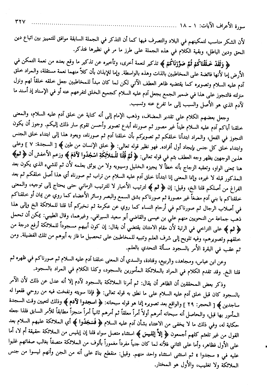 وجعل بعضهم الكلام على تقدير المضاف، وذهب الإمام إلى أنه كناية عن خلق آدم عليه السلام، والمعنى خلقنا أباكم آدم عليه السلام طينا غير مصور ثم صورناه أبدع تصوير وأحسن تقويم سار ذلك إليكم. وجوز أن يكون التجوز في الفعل، والمراد ابتدأنا خلقكم ثم تصويركم بأن خلقنا آدم ثم صورناه، ويعود هذا إلى ابتداء خلق الجنس وابتداء خلق كل جنس بإيجاد أول أفراده. فهو نظير قوله تعالى: خَلْقَ الْإِنْسانِ مِنْ طِينٍ [السجن: 7] وعلى هذين الوجهين يظهر وجه العطف بثم في قوله تعالى: ثُمَّ قُلْنا لِلْمَلائِكَةِ اسْجُدُوا لِآدَمَ وزعم الأخفش أن ثُمَّ هنا بمعنى الواو، وتعقبه الزجاج بأنه خطأ لا يجيزه الخليل وسيبويه ولا من يوثق بعلمه لأن ثم للشيء الذي يكون بعد المذكور قبله لا غيره، وإنما المعنى إنا ابتدأنا خلق آدم عليه السلام من تراب ثم صورناه أي هذا أصل خلقكم ثم بعد الفراغ من أصلكم قلنا إلخ، وقيل: إن ثُمَّ لترتيب الأخبار لا للترتيب الزماني حتى يحتاج إلى توجيه، والمعنى خلقناكم يا بني آدم مضغا غير مصورة ثم صورناكم بشق السمع والبصر وسائر الأعضاء كما روي عن يمان أو خلقناكم في أصلاب الرجال ثم صورناكم في أرحام النساء كما روي عن عكرمة ثم نخبركم أنا قلنا للملائكة إلخ وإلى هذا ذهب جماعة من النحويين منهم علي بن عيسى والقاضي أبو سعيد السيرافي. وغيرهما، وقال الطيبي: يمكن أن تحمل ثُمَّ على التراخي في الرتبة لأن مقام الامتنان يقتضي أن يقال: إن كون أبيهم مسجودا للملائكة أرفع درجة من خلقهم وتصويرهم، وفيه تلويح إلى شرف العلم وتنبيه للمخاطبين على تحصيل ما فاز به أبوهم من تلك الفضيلة. ومن ثم عقب في البقرة الأمر بالسجود مسألة التحدي بالعلم.