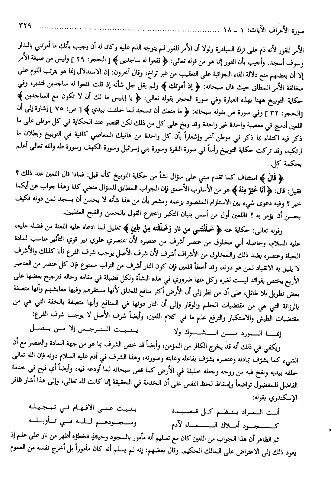 ثم الظاهر أن هذا الجواب من اللعين كان مع تسليم أنه مأمور بالسجود وحينئذ فخطؤه أظهر من نار على علم إذ يعود ذلك إلى الاعتراض على المالك الحكيم. وقال بعضهم: إنه لم يسلم أنه كان مأمورا بل أخرج نفسه من العموم