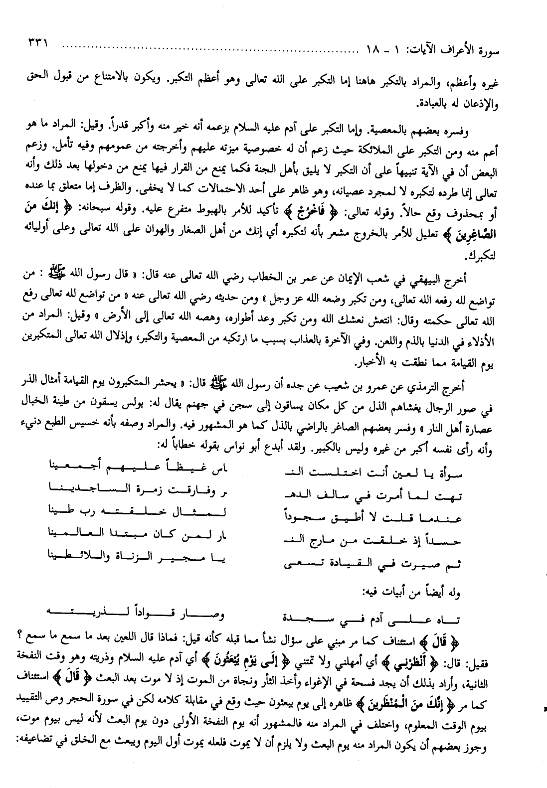 فقيل: قال: أَنْظِرْنِي أي أمهلني ولا تمتني إِلى يَوْمِ يُبْعَثُونَ أي آدم عليه السلام وذريته وهو وقت النفخة الثانية، وأراد بذلك أن يجد فسحة في الإغواء وأخذ الثأر ونجاة من الموت إذ لا موت بعد البعث قالَ استئناف كما مر إِنَّكَ مِنَ الْمُنْظَرِينَ ظاهره إلى يوم يبعثون حيث وقع في مقابلة كلامه لكن في سورة الحجر وص التقييد بيوم الوقت المعلوم، واختلف في المراد منه فالمشهور أنه يوم النفخة الأولى دون يوم البعث لأنه ليس بيوم موت، وجوز بعضهم أن يكون المراد منه يوم البعث ولا يلزم أن لا يموت فلعله يموت أول اليوم ويبعث مع الخلق في تضاعيفه:
