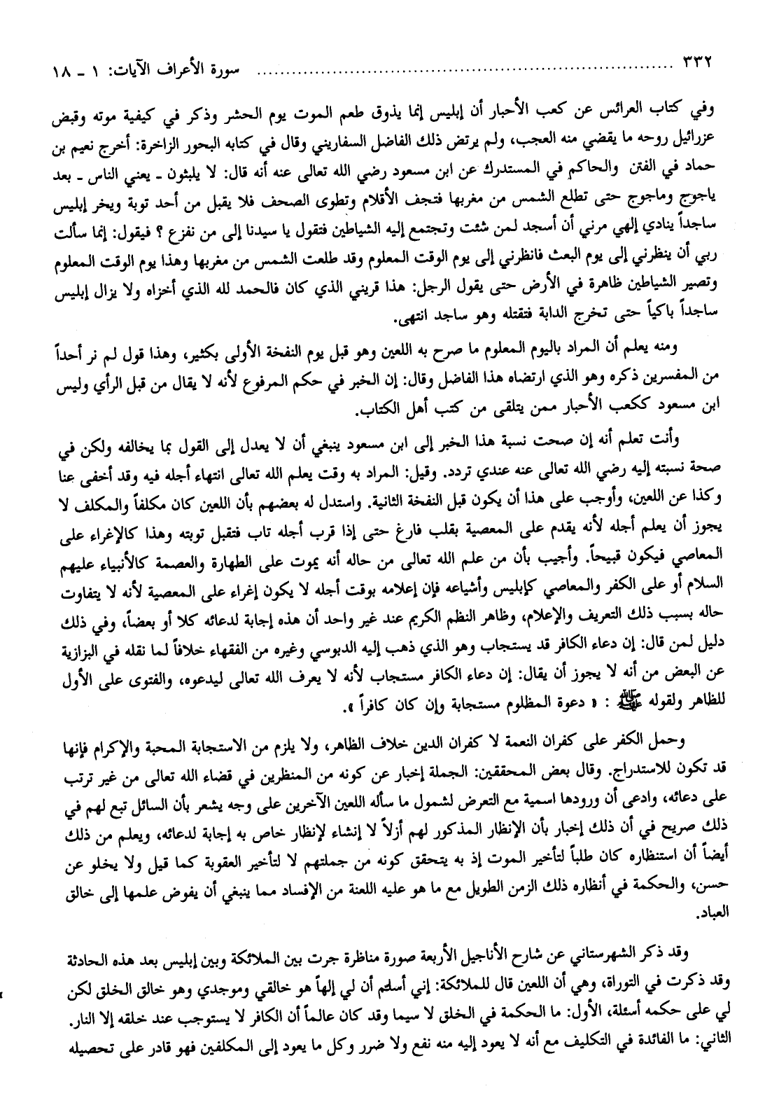 وفي كتاب العرائس عن كعب الأحبار أن إبليس إنما يذوق طعم الموت يوم الحشر وذكر في كيفية موته وقبض عزرائيل روحه ما يقتضي منه العجب، ولم يرتض ذلك الفاضل السفاريني
