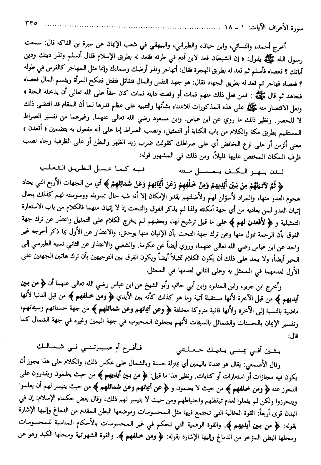 ثُمَّ لَآتِيَنَّهُمْ مِنْ بَيْنِ أَيْدِيهِمْ وَمِنْ خَلْفِهِمْ وَعَنْ أَيْمانِهِمْ وَعَنْ شَمائِلِهِمْ أي من الجهات الأربع التي يعتاد هجوم العدو منها، والمراد لأسوّلن لهم ولأضلنهم بقدر الإمكان إلا أنه شبه حال تسويله ووسوسته لهم كذلك بحال إتيان العدو لمن يعاديه من أي جهة أمكنته ولذا لم يذكر الفوق والتحت إذ لا إتيان منهما فالكلام من باب الاستعارة التمثيلية ولَأَقْعُدَنَّ لَهُمْ على ما قيل ترشيح لها، وبعضهم لم يخرج الكلام على التمثيل واعتذر عن ترك جهة الفوق بأن الرحمة تنزل منها وعن ترك جهة التحت بأن الإتيان منها يوحش، والاعتذار عن الأول بما ذكر أخرجه غير واحد عن ابن عباس رضي الله تعالى عنهما، وروي أيضا عن عكرمة. والشعبي والاعتذار عن الثاني نسبه الطبرسي إلى الحبر أيضا، ولا يبعد على ذلك أن يكون الكلام تمثيلا أيضا ويكون الفرق بين التوجيهين بأن ترك هاتين الجهتين على الأول لعدمهما في الممثل به وعلى الثاني لعدمها في الممثل.