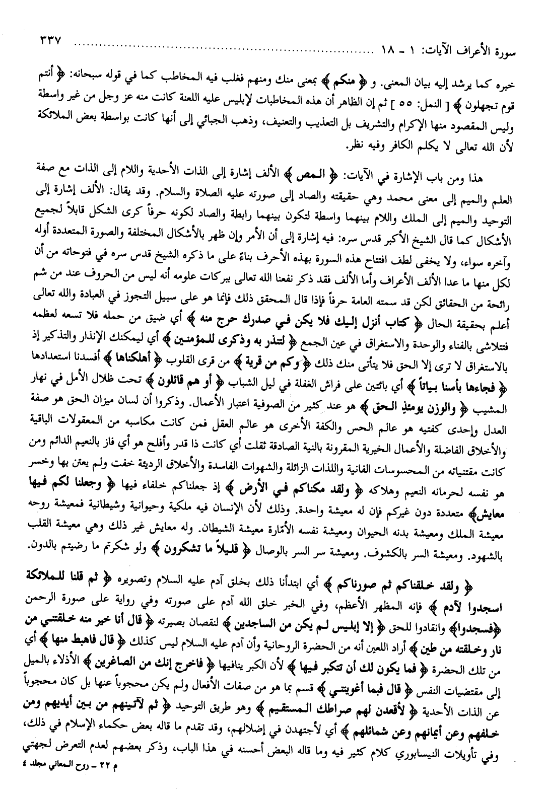 هذا ومن باب الإشارة في الآيات: المص الألف إشارة إلى الذات الأحدية واللام إلى الذات مع صفة العلم والميم إلى معنى محمد وهي حقيقته والصاد إلى صورته عليه الصلاة والسلام. وقد يقال: الألف إشارة إلى التوحيد والميم إلى الملك واللام بينهما واسطة لتكون بينهما رابطة والصاد لكونه حرفا كرى الشكل قابلا لجميع الأشكال كما قال الشيخ الأكبر قدس سره: فيه إشارة إلى أن الأمر وإن ظهر بالأشكال المختلفة والصورة المتعددة أوله وآخره سواء، ولا يخفى لطف افتتاح هذه السورة بهذه الأحرف بناء على ما ذكره الشيخ قدس سره في فتوحاته من أن لكل منها ما عدا الألف الأعراف وأما الألف فقد ذكر نفعنا الله تعالى ببركات علومه أنه ليس من الحروف عند من شم رائحة من الحقائق لكن قد سمته العامة حرفا فإذا قال المحقق ذلك فإنما هو على سبيل التجوز في العبادة والله تعالى أعلم بحقيقة الحال كِتابٌ أُنْزِلَ إِلَيْكَ فَلا يَكُنْ فِي صَدْرِكَ حَرَجٌ مِنْهُ أي ضيق من حمله فلا تسعه لعظمه فتتلاشى بالفناء والوحدة والاستغراق في عين الجمع لِتُنْذِرَ بِهِ وَذِكْرى لِلْمُؤْمِنِينَ أي ليمكنك الإنذار والتذكير إذ بالاستغراق لا ترى إلا الحق فلا يتأتى منك ذلك وَكَمْ مِنْ قَرْيَةٍ من قرى القلوب أَهْلَكْناها أفسدنا استعدادها فَجاءَها بَأْسُنا بَياتاً أي بائتين على فراش الغفلة في ليل الشباب أَوْ هُمْ قائِلُونَ تحت ظلال الأمل في نهار المشيب وَالْوَزْنُ يَوْمَئِذٍ الْحَقُّ هو عند كثير من الصوفية اعتبار الأعمال. وذكروا أن لسان ميزان الحق هو صفة العدل وإحدى كفتيه هو عالم الحس والكفة الأخرى هو عالم العقل فمن كانت مكاسبه من المعقولات الباقية والأخلاق الفاضلة والأعمال الخيرية المقرونة بالنية الصادقة ثقلت أي كانت ذا قدر وأفلح هو أي فاز بالنعيم الدائم ومن كانت مقتنياته من المحسوسات الفانية واللذات الزائلة والشهوات الفاسدة والأخلاق الرديئة خفت ولم يعتن بها وخسر هو نفسه لحرمانه النعيم وهلاكه وَلَقَدْ مَكَّنَّاكُمْ فِي الْأَرْضِ إذ جعلناكم خلفاء فيها وَجَعَلْنا لَكُمْ فِيها مَعايِشَ متعددة دون غيركم فإن له معيشة واحدة. وذلك لأن الإنسان فيه ملكية وحيوانية وشيطانية فمعيشة روحه معيشة الملك ومعيشة بدنه الحيوان ومعيشة نفسه الأمارة معيشة الشيطان. وله معايش غير ذلك وهي معيشة القلب بالشهود. ومعيشة السر بالكشوف. ومعيشة سر السر بالوصال قَلِيلًا ما تَشْكُرُونَ ولو شكرتم ما رضيتم بالدون.