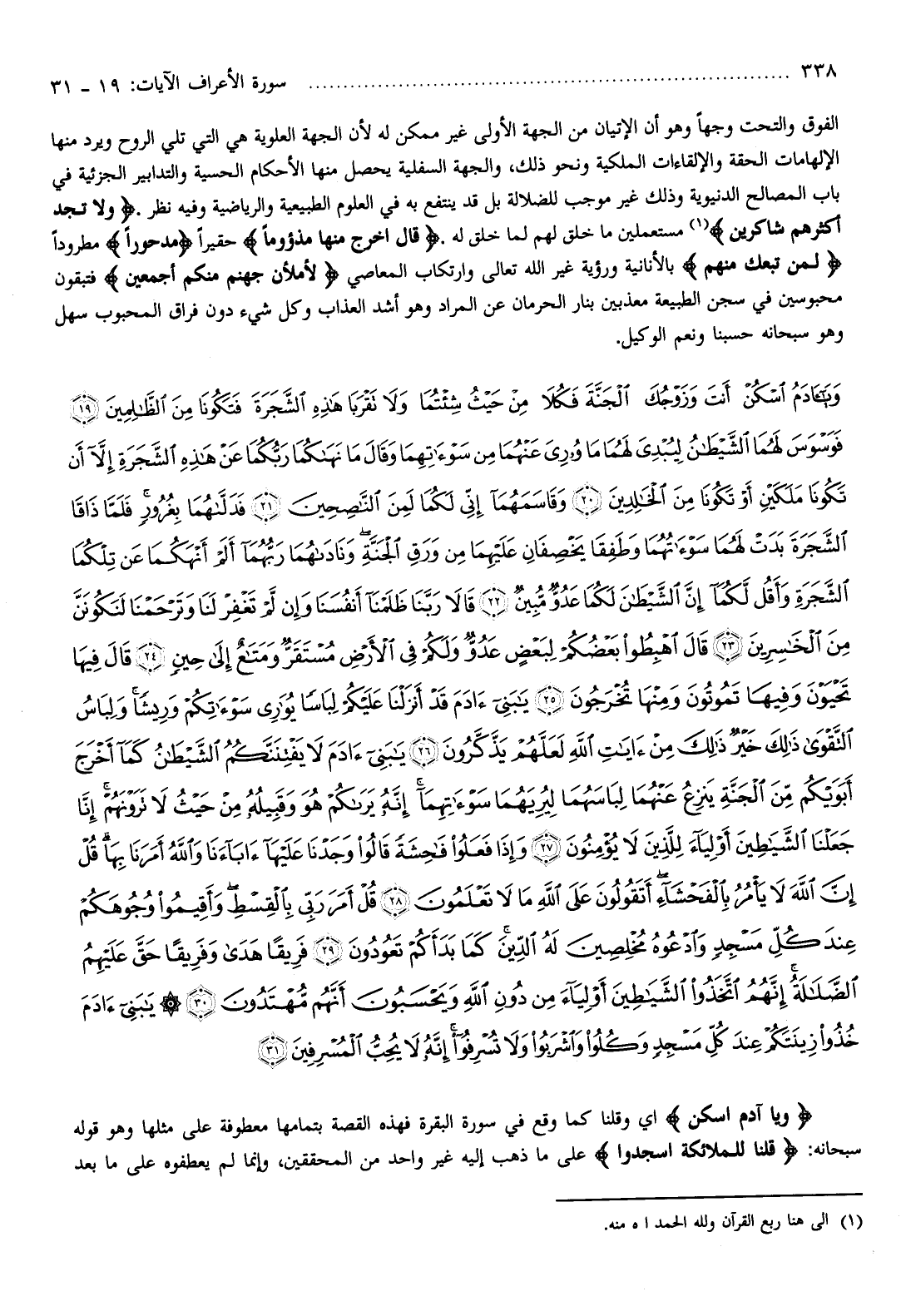 الفوق والتحت وجها وهو أن الإتيان من الجهة الأولى غير ممكن له لأن الجهة العلوية هي التي تلي الروح ويرد منها الإلهامات الحقة والإلقاءات الملكية ونحو ذلك، والجهة السفلية يحصل منها الأحكام الحسية والتدابير الجزئية في باب المصالح الدنيوية وذلك غير موجب للضلالة بل قد ينتفع به في العلوم الطبيعية والرياضية وفيه نظر. وَلا تَجِدُ أَكْثَرَهُمْ شاكِرِينَ (¬1) مستعملين ما خلق لهم لما خلق له. قالَ اخْرُجْ مِنْها مَذْؤُماً حقيرا مَدْحُوراً مطرودا لَمَنْ تَبِعَكَ مِنْهُمْ بالأنانية ورؤية غير الله تعالى وارتكاب المعاصي لَأَمْلَأَنَّ جَهَنَّمَ مِنْكُمْ أَجْمَعِينَ فتبقون محبوسين في سجن الطبيعة معذبين بنار الحرمان عن المراد وهو أشد العذاب وكل شيء دون فراق المحبوب سهل وهو سبحانه حسبنا ونعم الوكيل.