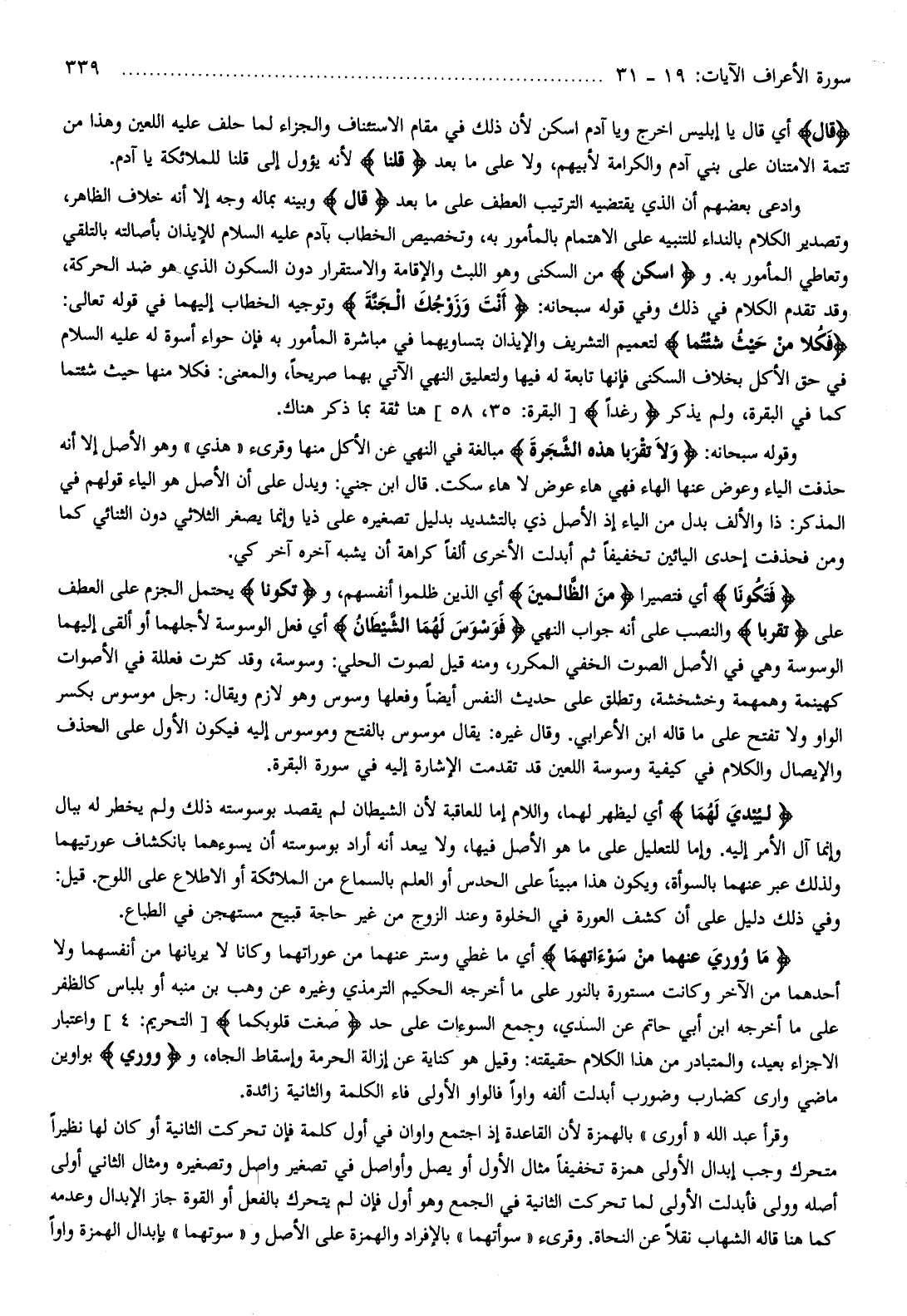 وقوله سبحانه: وَلا تَقْرَبا هذِهِ الشَّجَرَةَ مبالغة في النهي عن الأكل منها وقرىء «هذي» وهو الأصل إلا أنه حذفت الياء وعوض عنها الهاء فهي هاء عوض لا هاء سكت. قال ابن جني: ويدل على أن الأصل هو الياء قولهم في المذكر: ذا والألف بدل من الياء إذ الأصل ذي بالتشديد بدليل تصغيره على ذيا وإنما يصغر الثلاثي دون الثنائي كما ومن فحذفت إحدى اليائين تخفيفا ثم أبدلت الأخرى ألفا كراهة أن يشبه آخره آخر كي.
