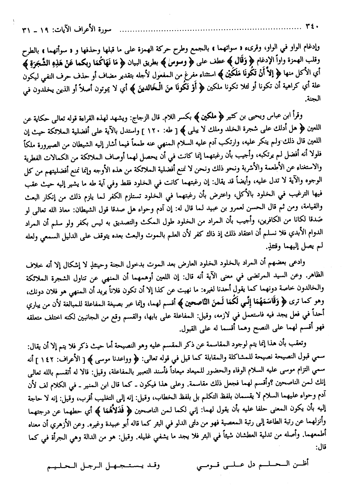وادعى بعضهم أن المراد بالخلود الخلود العارض بعد الموت بدخول الجنة وحينئذ لا إشكال إلا أنه خلاف الظاهر. وعن السيد المرتضى في معنى الآية أنه قال: إن اللعين أوهمهما أن المنهي عن تناول الشجرة الملائكة والخالدون خاصة دونهما كما يقول أحدنا لغيره: ما نهيت عن كذا إلا أن تكون فلانا يريد أن المنهي هو فلان دونك، وهو كما ترى وَقاسَمَهُما إِنِّي لَكُما لَمِنَ النَّاصِحِينَ أقسم لهما، وإنما عبر بصيغة المفاعلة للمبالغة لأن من يباري أحدا في فعل يجد فيه فاستعمل في لازمه، وقيل: المفاعلة على بابها، والقسم وقع من الجانبين لكنه اختلف متعلقه فهو أقسم لهما على النصح وهما أقسما له على القبول.