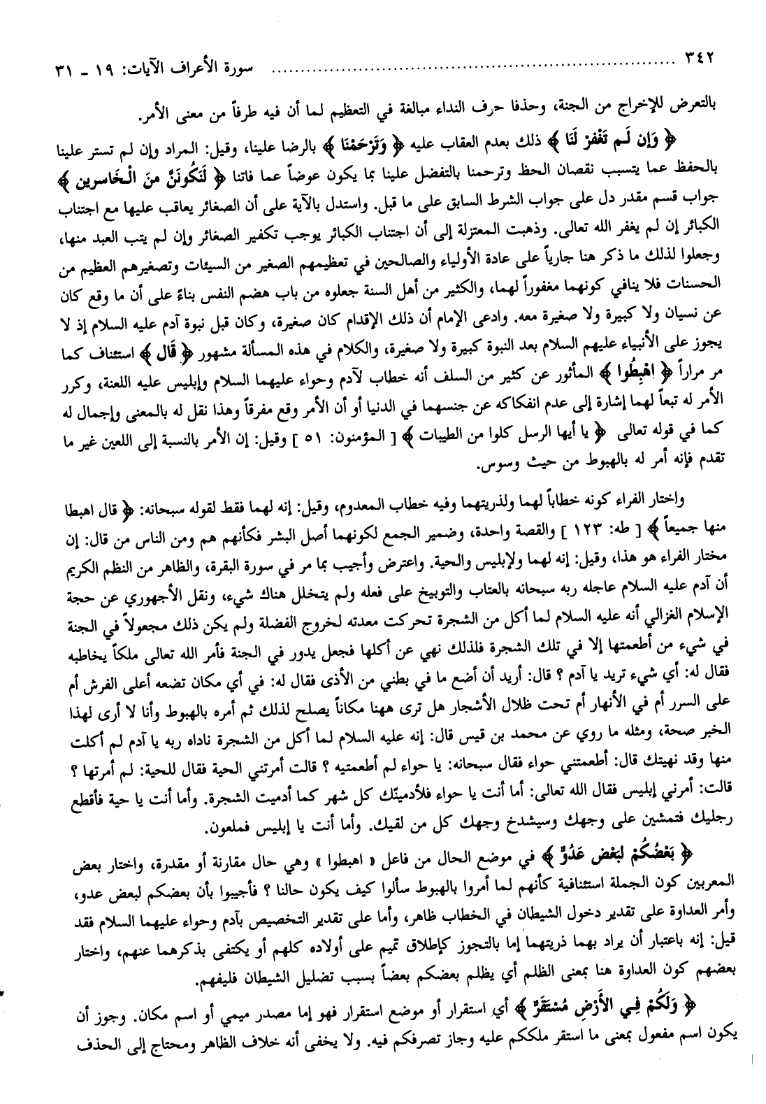 واختار الفراء كونه خطابا لهما ولذريتهما وفيه خطاب المعدوم، وقيل: إنه لهما فقط لقوله سبحانه: قالَ اهْبِطا مِنْها جَمِيعاً [طه: 123] والقصة واحدة، وضمير الجمع لكونهما أصل البشر فكأنهم هم ومن الناس من قال: إن مختار الفراء هو هذا، وقيل: إنه لهما ولإبليس والحية. واعترض وأجيب بما مر في سورة البقرة، والظاهر من النظم الكريم أن آدم عليه السلام عاجله ربه سبحانه بالعتاب والتوبيخ على فعله ولم يتخلل هناك شيء، ونقل الأجهوري عن حجة الإسلام الغزالي أنه عليه السلام لما أكل من الشجرة تحركت معدته لخروج الفضلة ولم يكن ذلك مجعولا في الجنة في شيء من أطعمتها إلا في تلك الشجرة فلذلك نهي عن أكلها فجعل يدور في الجنة فأمر الله تعالى ملكا يخاطبه فقال له: أي شيء تريد يا آدم؟ قال: أريد أن أضع ما في بطني من الأذى فقال له: في أي مكان تضعه أعلى الفرش أم على السرر أم في الأنهار أم تحت ظلال الأشجار هل ترى هاهنا مكانا يصلح لذلك ثم أمره بالهبوط وأنا لا أرى لهذا الخبر صحة، ومثله ما