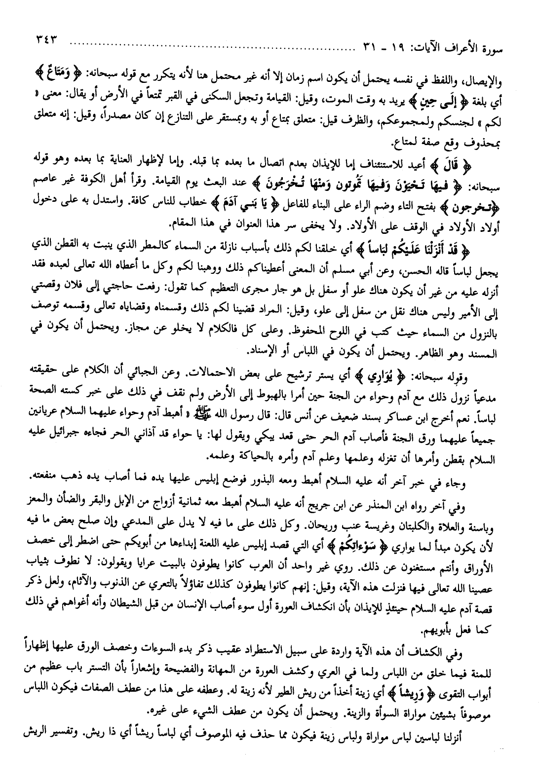 وكل ذلك على ما فيه لا يدل على المدعي وإن صلح بعض ما فيه لأن يكون مبدأ لما يواري سَوْآتِكُمْ أي التي قصد إبليس عليه اللعنة إبداءها من أبويكم حتى اضطر إلى خصف الأوراق وأنتم مستغنون عن ذلك. روي غير واحد أن العرب كانوا يطوفون بالبيت عرايا ويقولون: لا نطوف بثياب عصينا الله تعالى فيها فنزلت هذه الآية، وقيل: إنهم كانوا يطوفون كذلك تفاؤلا بالتعري عن الذنوب والآثام، ولعل ذكر قصة آدم عليه السلام حينئذ للإيذان بأن انكشاف العورة أول سوء أصاب الإنسان من قبل الشيطان وأنه أغواهم في ذلك كما فعل بأبويهم.