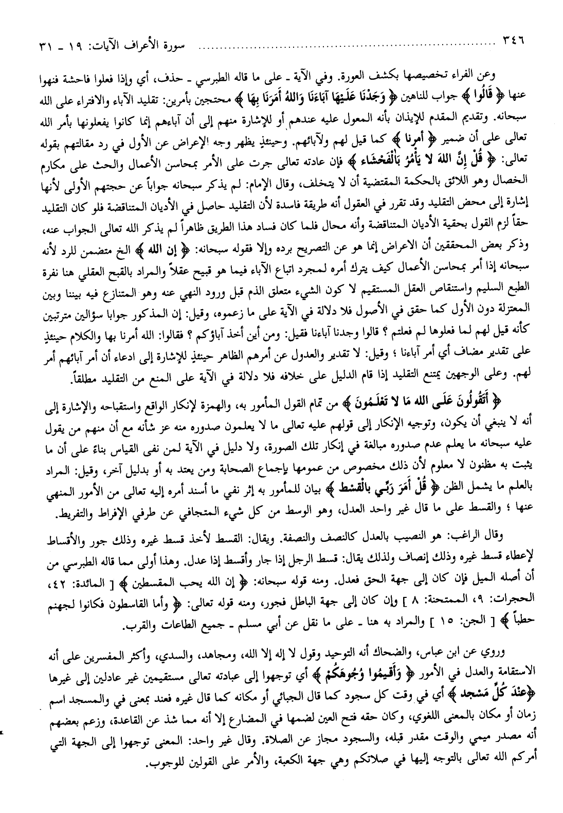 وروي عن ابن عباس، والضحاك أنه التوحيد وقول لا إله إلا الله، ومجاهد، والسدي، وأكثر المفسرين على أنه الاستقامة والعدل في الأمور وَأَقِيمُوا وُجُوهَكُمْ أي توجهوا إلى عبادته تعالى مستقيمين غير عادلين إلى غيرها عِنْدَ كُلِّ مَسْجِدٍ أي في وقت كل سجود كما قال الجبائي أو مكانه كما قال غيره فعند بمعنى في والمسجد اسم زمان أو مكان بالمعنى اللغوي، وكان حقه فتح العين لضمها في المضارع إلا أنه مما شذ عن القاعدة، وزعم بعضهم أنه مصدر ميمي والوقت مقدر قبله، والسجود مجاز عن الصلاة. وقال غير واحد: المعنى توجهوا إلى الجهة التي أمركم الله تعالى بالتوجه إليها في صلاتكم وهي جهة الكعبة، والأمر على القولين للوجوب.