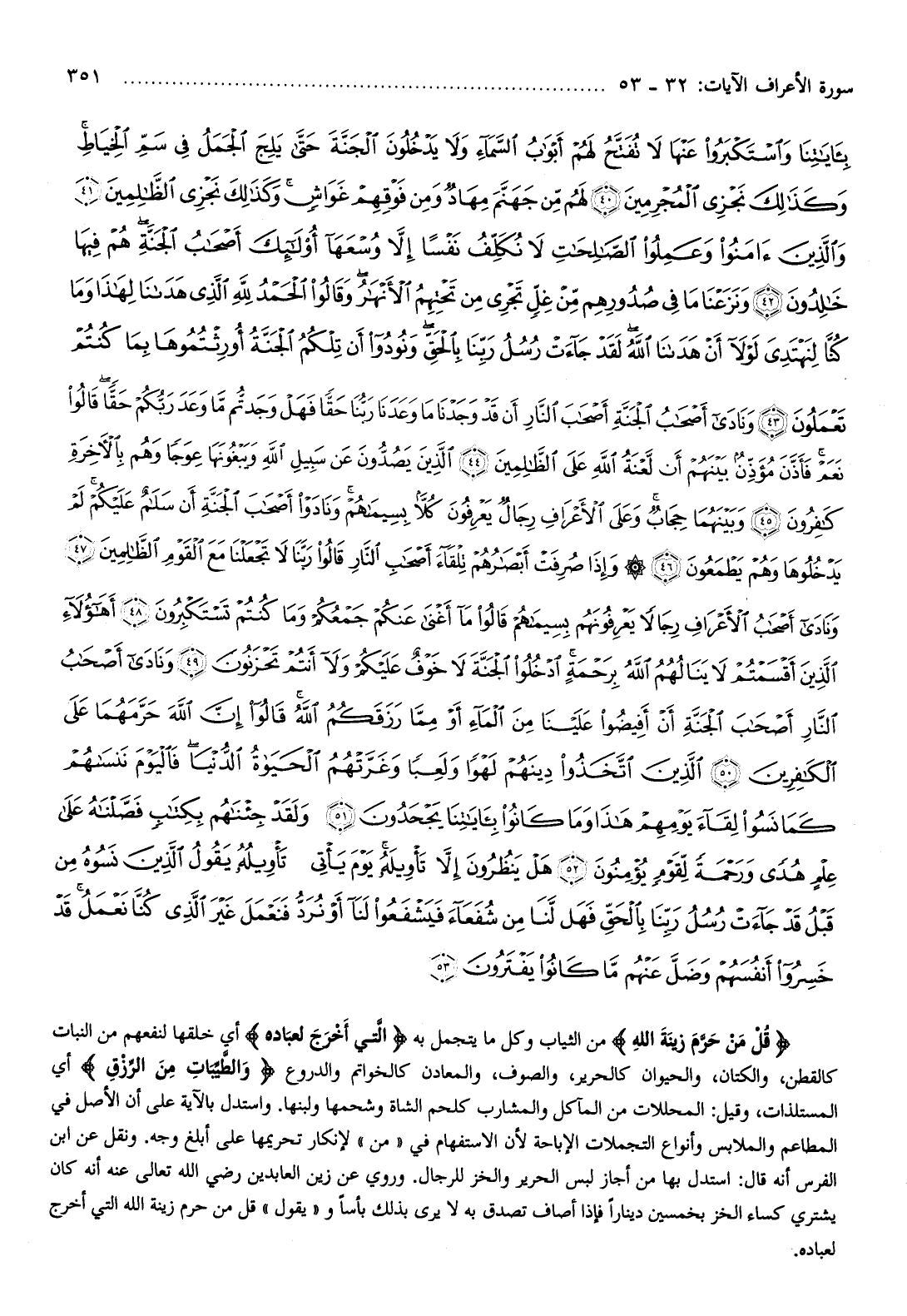 قُلْ مَنْ حَرَّمَ زِينَةَ اللَّهِ من الثياب وكل ما يتجمل به الَّتِي أَخْرَجَ لِعِبادِهِ أي خلقها لنفعهم من النبات كالقطن، والكتان، والحيوان كالحرير، والصوف، والمعادن كالخواتم والدروع وَالطَّيِّباتِ مِنَ الرِّزْقِ أي المستلذات، وقيل: المحللات من المآكل والمشارب كلحم الشاة وشحمها ولبنها. واستدل بالآية على أن الأصل في المطاعم والملابس وأنواع التجملات الإباحة لأن الاستفهام في «من» لإنكار تحريمها على أبلغ وجه. ونقل عن ابن الفرس أنه قال: استدل بها من أجاز لبس الحرير والخز للرجال.