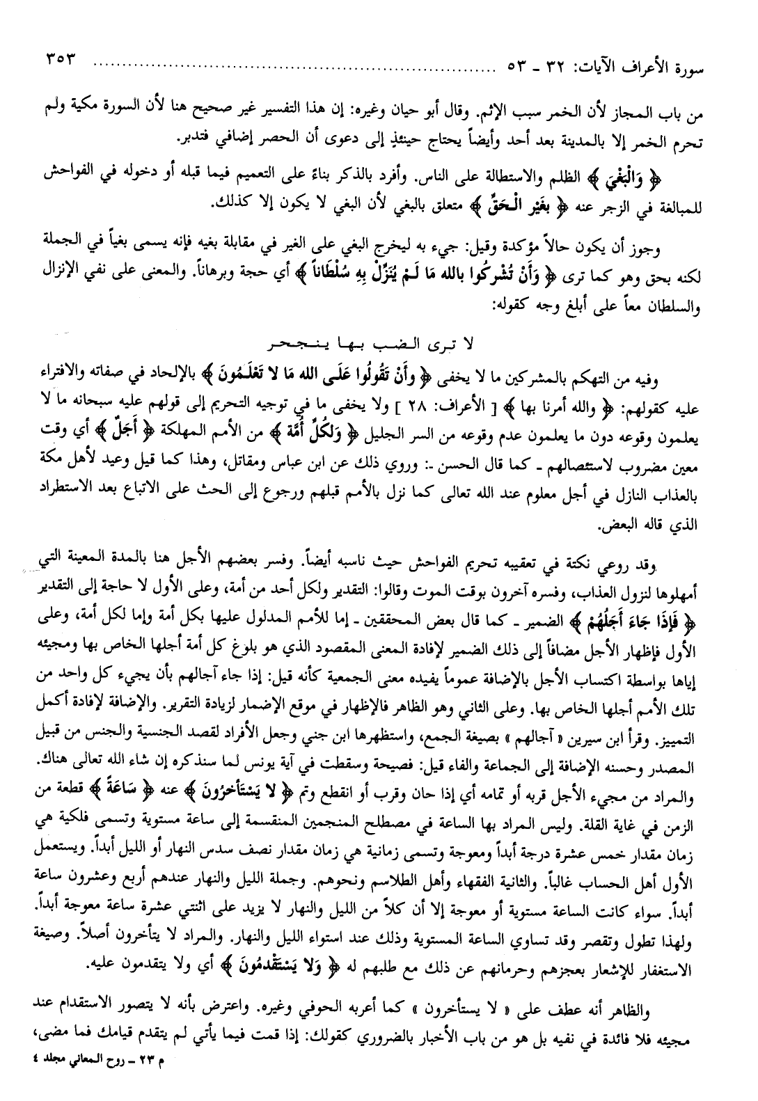 لا ترى الضب بها ينجحر وفيه من التهكم بالمشركين ما لا يخفى وَأَنْ تَقُولُوا عَلَى اللَّهِ ما لا تَعْلَمُونَ بالإلحاد في صفاته والافتراء عليه كقولهم: وَاللَّهُ أَمَرَنا بِها [الأعراف: 28] ولا يخفى ما في توجيه التحريم إلى قولهم عليه سبحانه ما لا يعلمون وقوعه دون ما يعلمون عدم وقوعه من السر الجليل وَلِكُلِّ أُمَّةٍ من الأمم المهلكة أَجَلٌ أي وقت معين مضروب لاستئصالهم- كما قال الحسن-: وروي ذلك عن ابن عباس ومقاتل، وهذا كما قيل وعيد لأهل مكة بالعذاب النازل في أجل معلوم عند الله تعالى كما نزل بالأمم قبلهم ورجوع إلى الحث على الاتباع بعد الاستطراد الذي قاله البعض.