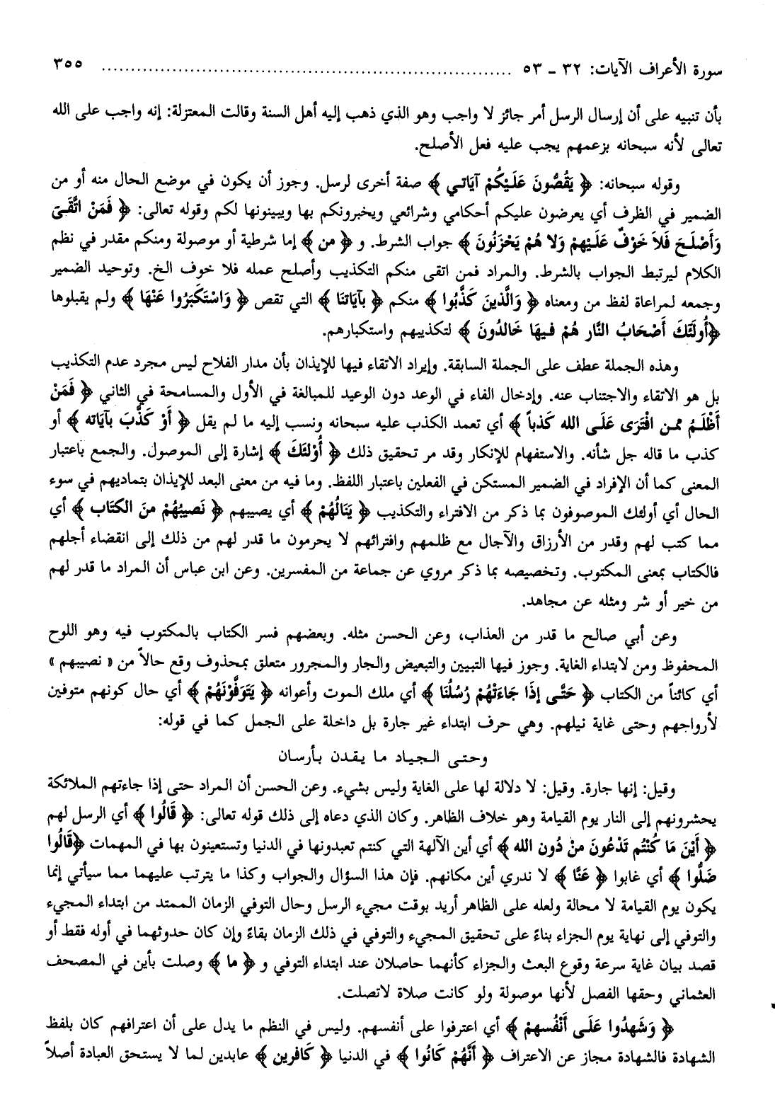 وقوله سبحانه: يَقُصُّونَ عَلَيْكُمْ آياتِي صفة أخرى لرسل. وجوز أن يكون في موضع الحال منه أو من الضمير في الظرف أي يعرضون عليكم أحكامي وشرائعي ويخبرونكم بها ويبينونها لكم وقوله تعالى: فَمَنِ اتَّقى وَأَصْلَحَ فَلا خَوْفٌ عَلَيْهِمْ وَلا هُمْ يَحْزَنُونَ جواب الشرط. ومن إما شرطية أو موصولة ومنكم مقدر في نظم الكلام ليرتبط الجواب بالشرط. والمراد فمن اتقى منكم التكذيب وأصلح عمله فلا خوف إلخ. وتوحيد الضمير وجمعه لمراعاة لفظ من ومعناه وَالَّذِينَ كَذَّبُوا منكم بِآياتِنا التي تقص وَاسْتَكْبَرُوا عَنْها ولم يقبلوها أُولئِكَ أَصْحابُ النَّارِ هُمْ فِيها خالِدُونَ لتكذيبهم واستكبارهم.
