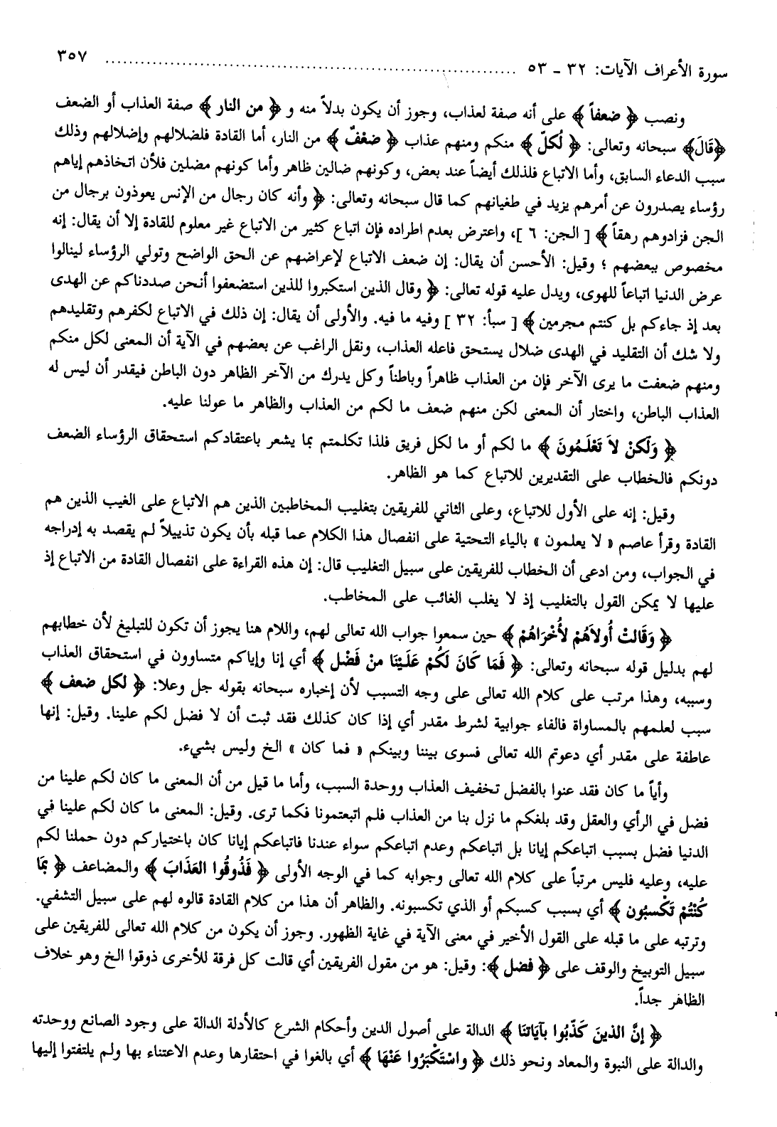 ونصب ضِعْفاً على أنه صفة لعذاب، وجوز أن يكون بدلا منه ومِنَ النَّارِ صفة العذاب أو الضعف قالَ سبحانه وتعالى: لِكُلٍّ منكم ومنهم عذاب ضِعْفٌ من النار، أما القادة فلضلالهم وإضلالهم وذلك سبب الدعاء السابق، وأما الاتباع فلذلك أيضا عند بعض، وكونهم ضالين ظاهر وأما كونهم مضلين فلأن اتخاذهم إياهم رؤساء يصدرون عن أمرهم يزيد في طغيانهم كما قال سبحانه وتعالى: وَأَنَّهُ كانَ رِجالٌ مِنَ الْإِنْسِ يَعُوذُونَ بِرِجالٍ مِنَ الْجِنِّ فَزادُوهُمْ رَهَقاً [الجن: 6] ، واعترض بعدم اطراده فإن اتباع كثير من الاتباع غير معلوم للقادة إلا أن يقال: إنه مخصوص ببعضهم وقيل: الأحسن أن يقال: إن ضعف الاتباع لإعراضهم عن الحق الواضح وتولي الرؤساء لينالوا عرض الدنيا اتباعا للهوى، ويدل عليه قوله تعالى: وقالَ الَّذِينَ اسْتَكْبَرُوا لِلَّذِينَ اسْتُضْعِفُوا أَنَحْنُ صَدَدْناكُمْ عَنِ الْهُدى بَعْدَ إِذْ جاءَكُمْ بَلْ كُنْتُمْ مُجْرِمِينَ [سبأ: 32] وفيه ما فيه. والأولى أن يقال: إن ذلك في الاتباع لكفرهم وتقليدهم ولا شك أن التقليد في الهدى ضلال يستحق فاعله العذاب، ونقل الراغب عن بعضهم في الآية أن المعنى لكل منكم ومنهم ضعفت ما يرى الآخر فإن من العذاب ظاهرا وباطنا وكل يدرك من الآخر الظاهر دون الباطن فيقدر أن ليس له العذاب الباطن، واختار أن المعنى لكن منهم ضعف ما لكم من العذاب والظاهر ما عولنا عليه.