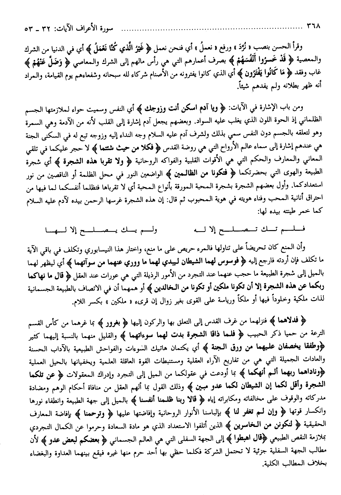 ومن باب الإشارة في الآيات: وَيا آدَمُ اسْكُنْ أَنْتَ وَزَوْجُكَ أي النفس وسميت حواء لملازمتها الجسم الظلماني إذ الحوة اللون الذي يغلب عليه السواد. وبعضهم يجعل آدم إشارة إلى القلب لأنه من الآدمة وهي السمرة وهو لتعلقه بالجسم دون النفس سمي بذلك ولشرف آدم عليه السلام وجه النداء إليه وزوجه تبع له في السكنى الجنة هي عندهم إشارة إلى سماء عالم الأرواح التي هي روضة القدس فَكُلا مِنْ حَيْثُ شِئْتُما لا حجر عليكما في تلقي المعاني والمعارف والحكم التي هي الأقوات القلبية والفواكه الروحانية وَلا تَقْرَبا هذِهِ الشَّجَرَةَ أي شجرة الطبيعة والهوى التي بحضرتكما فَتَكُونا مِنَ الظَّالِمِينَ الواضعين النور في محل الظلمة أو الناقصين من نور استعدادكما. وأول بعضهم الشجرة بشجرة المحبة المورقة بأنواع المحبة أي لا تقرباها فتظلما أنفسكما لما فيها من احتراق أنانية المحب وفناء هويته في هوية المحبوب ثم قال: إن هذه الشجرة غرسها الرحمن بيده لآدم عليه السلام كما خمر طينته بيده لها: