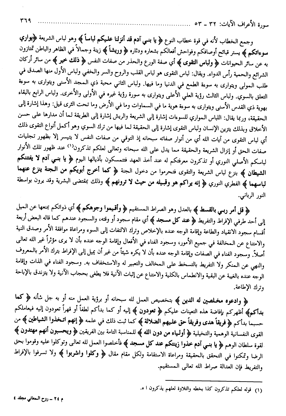 وَادْعُوهُ مُخْلِصِينَ لَهُ الدِّينَ بتخصيص العمل لله سبحانه أو برؤية العمل منه أو به جل شأنه كَما بَدَأَكُمْ أظهركم بإفاضة هذه التعينات عليكم تَعُودُونَ إليه أو كما بدأكم لطفا أو قهرا تعودون إليه فيعاملكم حسبما بدأكم فَرِيقاً هَدى وَفَرِيقاً حَقَّ عَلَيْهِمُ الضَّلالَةُ كما ثبت ذلك في علمه إِنَّهُمُ اتَّخَذُوا الشَّياطِينَ من القوى النفسانية الوهمية والتخيلية أَوْلِياءَ مِنْ دُونِ اللَّهِ للمناسبة التامة بين الفريقين وَيَحْسَبُونَ أَنَّهُمْ مُهْتَدُونَ لقوة سلطان الوهم يا بَنِي آدَمَ خُذُوا زِينَتَكُمْ عِنْدَ كُلِّ مَسْجِدٍ فأخلصوا العمل لله تعالى وتوكلوا عليه وقوموا بحق الرضا وتمكنوا في التحقق بالحقيقة ومراعاة الاستقامة ولكل مقام مقال وَكُلُوا وَاشْرَبُوا ولا تسرفوا بالإفراط والتفريط فإن العدالة صراط الله تعالى المستقيم.